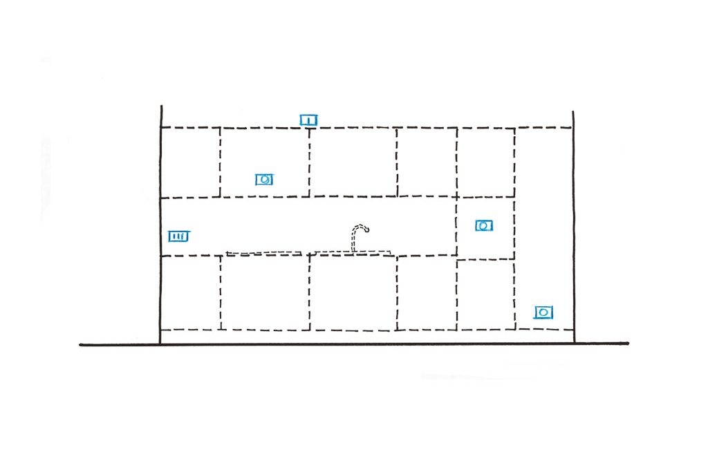 la pianta del locale riportando tutte le misure e gli elementi fissi (porta, finestra, calorifero, attacchi acqua e gas, pilastri e nicchie) nella posizione corretta. Su questa base, poi