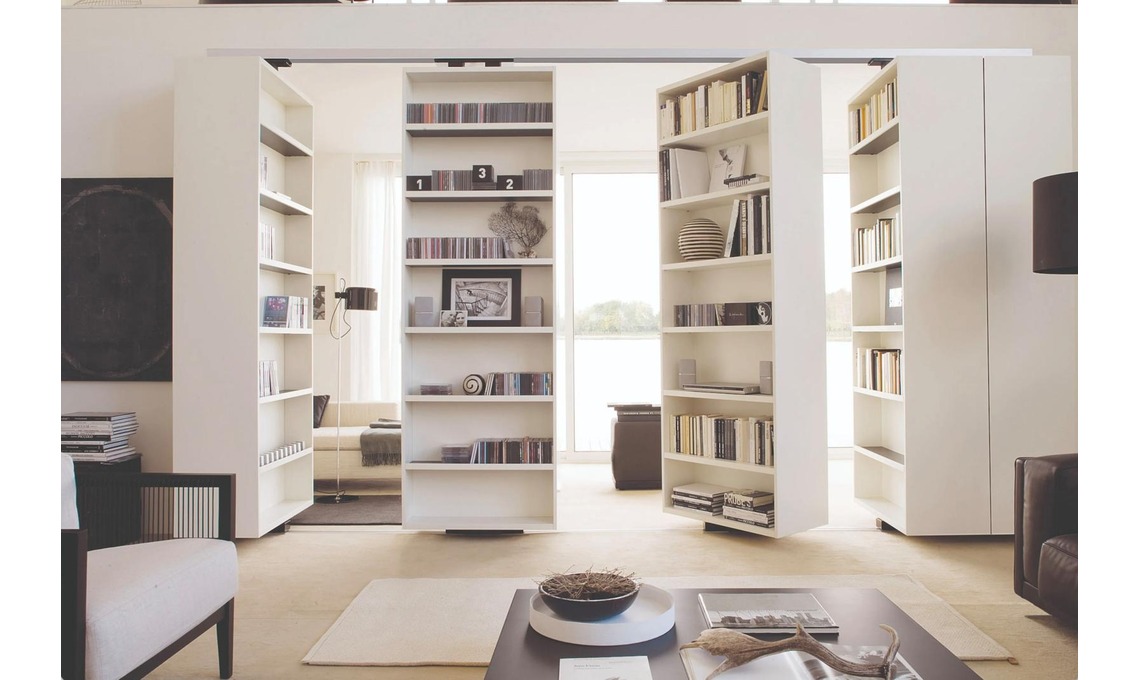 Come isolare una zona lettura o uno studio dal resto del living sfruttando tutto lo spazio disponibile? Con un sistema di librerie formate da moduli che si possono spostare facilmente dando vita a una parete attrezzata... magica.