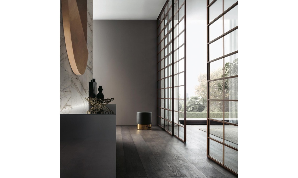 In foto: il sistema Soho che si ispira ai divisori delle case giapponesi, qui con struttura in legno Noce 15, maniglia 303 bronzo e specchiature in vetro 67 riflettente chiaro [Rimadesio].