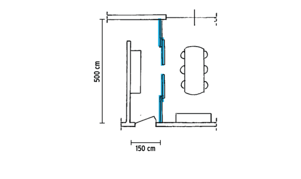 In foto: sistema Schüco Interior con profili di soli 43 mm e altezza fino a 350 cm, senza limiti di larghezza. In base allo spessore del vetro l’abbattimento acustico va da 40 a 45.