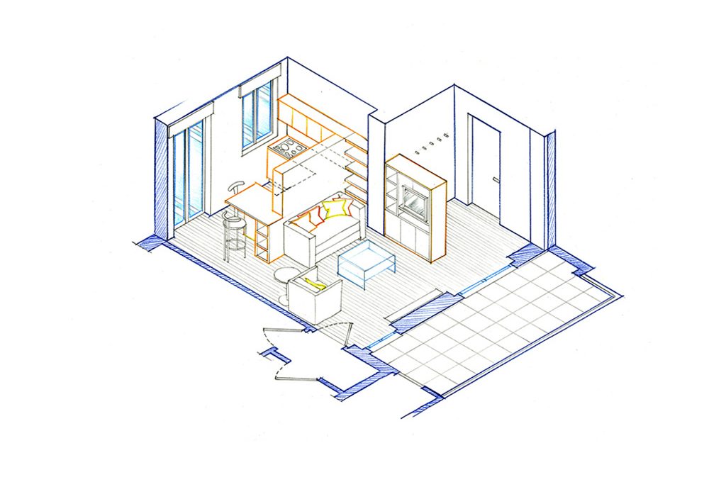 - La cucina rimane nella stessa posizione per mantenere gli attacchi esistenti. È risolta con un mobile a “U” rivolto verso le finestre sul cortile (a est), che termina con un piccolo tavolo a penisola, servito da un paio di sgabelli per colazioni veloci. Il mobile della cucina sul lato parete ha pensili alti cm 60, sul lato lungo, invece, ha solo mensole profonde cm 20, con uno schienale alto cm 110 dal top (cm 200 da terra) che scherma il soggiorno.