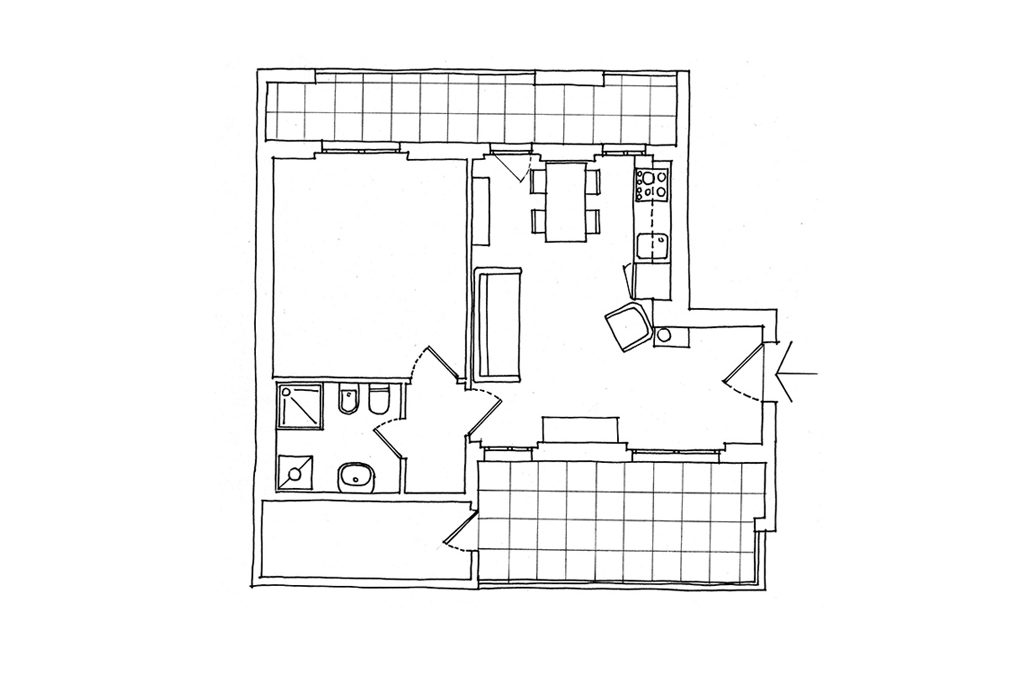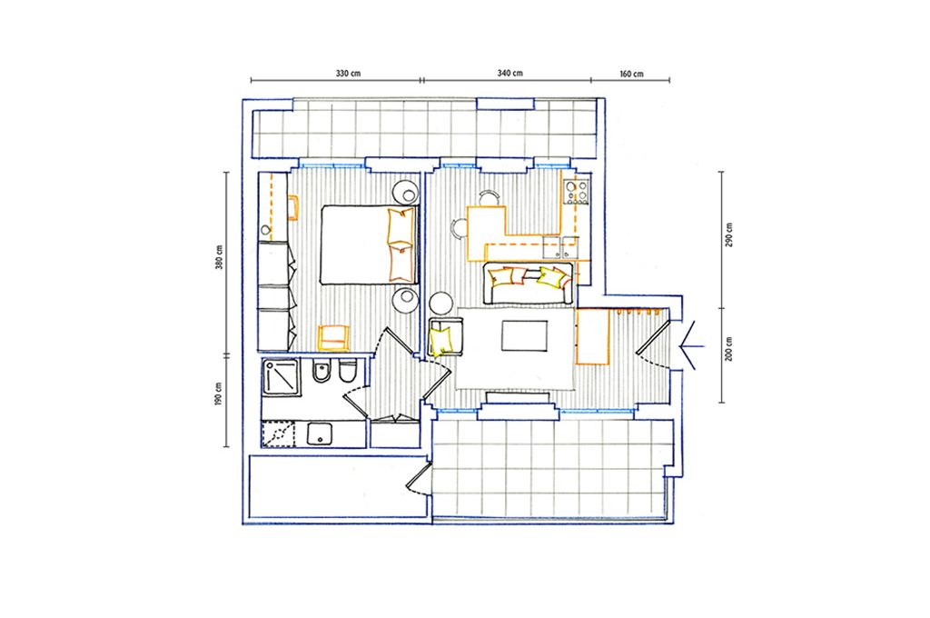 Ci scrive Valeria: «Ho preso in affitto una casina dove mi lascerebbero i mobili della cucina e un grande divano, ma preferirei cambiare tutto anche per creare, con i vostri pratici consigli, un ambiente più raccolto e accogliente. Non cucino molto e di rado mangio a casa, quindi desidererei privilegiare l’angolo relax-tv rispetto a cucina e tavolo pranzo. Vorrei schermare l’ingresso e creare, in camera, anche un angolo craft».