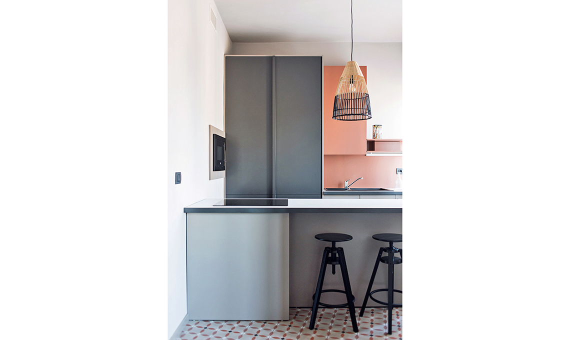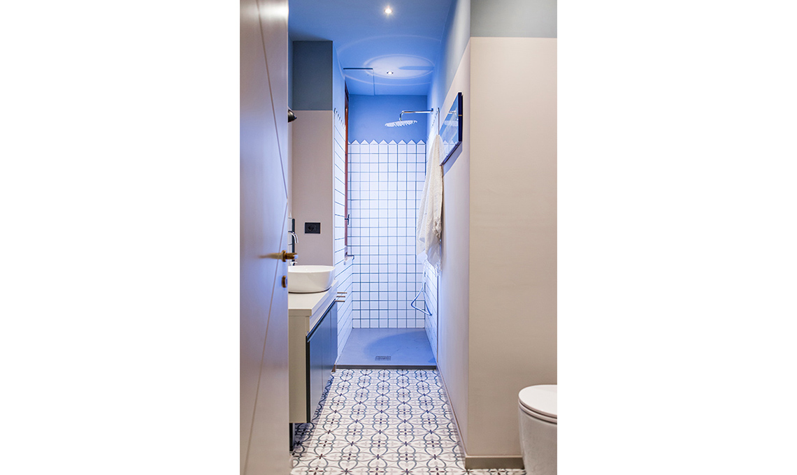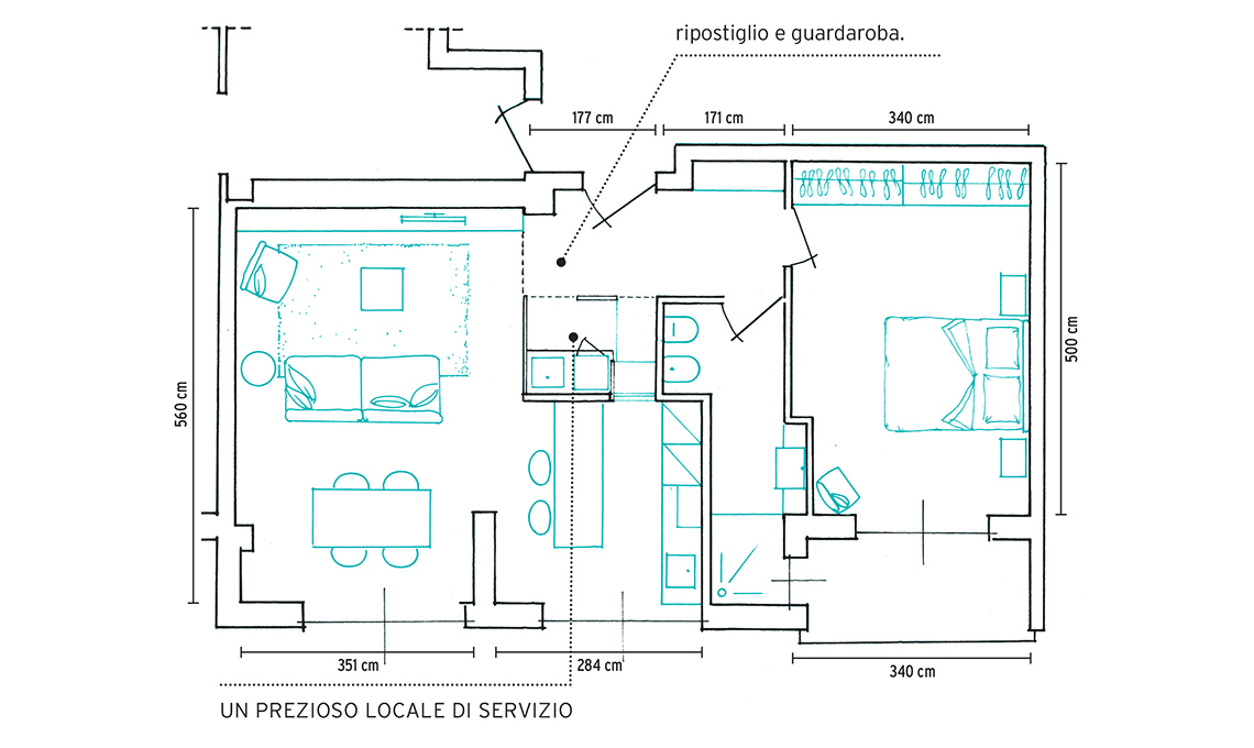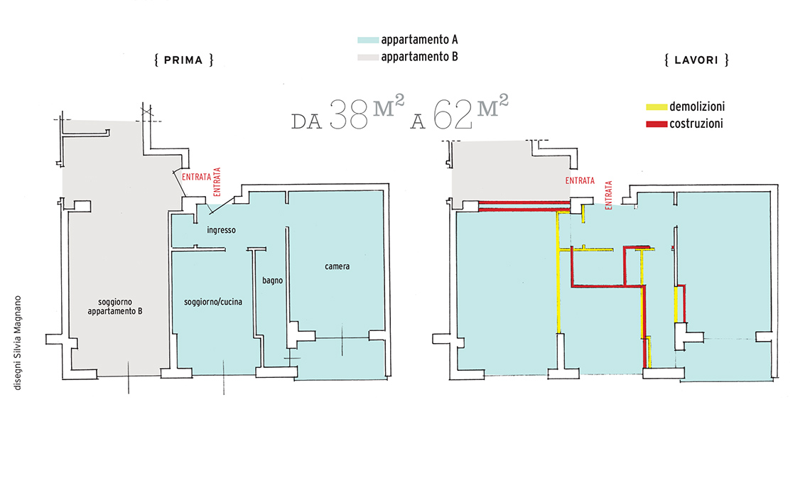 Separando con un tramezzo il soggiorno dell’appartamento B dal suo ingresso e demolendo il muro che divideva i due immobili, l’appartamento A acquista un living grande con cucina a vista, parzialmente separata. Dall’ampio ingresso è stata ricavata una lavanderia perché serviva una stanza, che non fosse il bagno, dove lavare, stendere, tenere scope, scala e asse da stiro; e in corridoio, nella nicchia, c’è anche un piccolo ripostiglio che ospita lo scaldabagno.