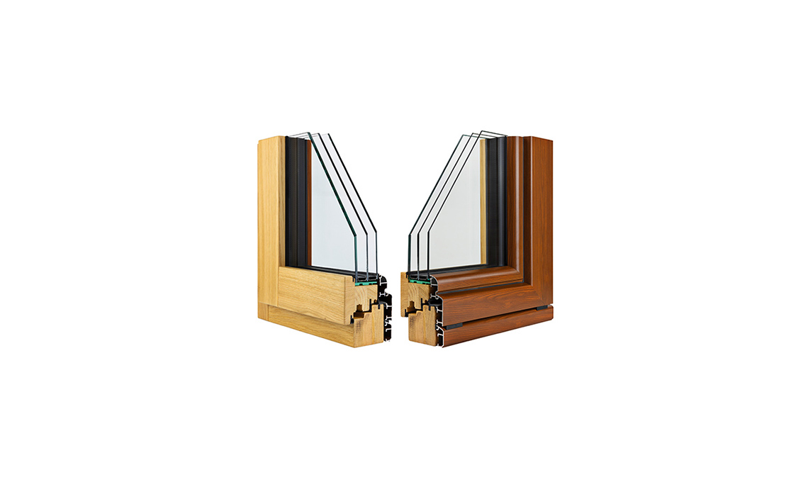 Finestra triplovetro Eternity Clima con interno in legno lamellare ed esterno rivestito con profili in alluminio dalle forme complanari o più classiche, qui finitura effetto legno [Alpilegno].