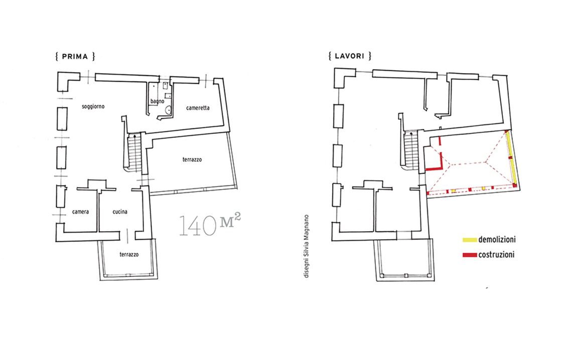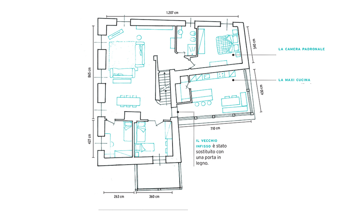 I ragazzi sono cresciuti e ora la loro stanza non basta più... come fare? L’architetto CF style Manuela Marconi propone di sfruttare il più grande dei terrazzi (tra l’altro con una vista mozzafiato) per trasformarlo in un locale in più. Il Piano Regolatore lo consente, quindi... detto fatto! Ottenuti i permessi sono iniziati i lavori per trasformare il terrazzo in una grandissima cucina, che ora viene vissuta dalla famiglia a tutte le ore del giorno. La camera grande è tornata ai genitori e le due piccole (una è la ex cucina) sono state destinate ai figli.