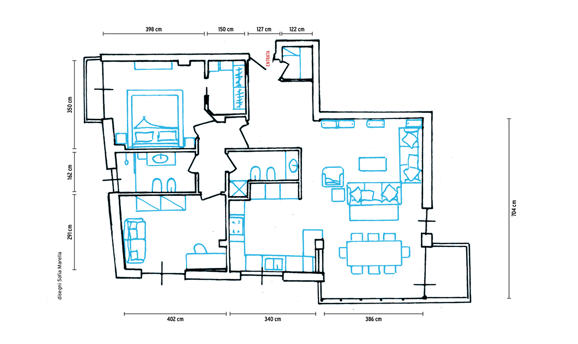 Al fine di ottimizzare posizione e grandezza delle stanze, è stata rivoluzionata la struttura dell’appartamento, eliminando corridoi e spazi inutilizzati e spostando la cucina stretta, isolata e un po’ impersonale per trasformarla in un ambiente aperto, moderno e accogliente, affacciato sulla zona living. In sostanza è stato creato un luminoso open space che riunisce salone, pranzo e cucina e diventa il cuore pulsante della casa. Nella zona notte, adesso ben separata da quella giorno, è stata ricavata la camera matrimoniale dove prima c’era la cucina: inglobando il bagno di servizio è abbastanza grande per accogliere una cabina armadio. Ora il secondo bagno è adiacente alla cucina, e questa parte della casa risulta molto più funzionale e confortevole. All’ingresso, poi, non poteva mancare uno sgabuzzino nascosto e super contenitivo, elemento indispensabile per qualsiasi abitazione.