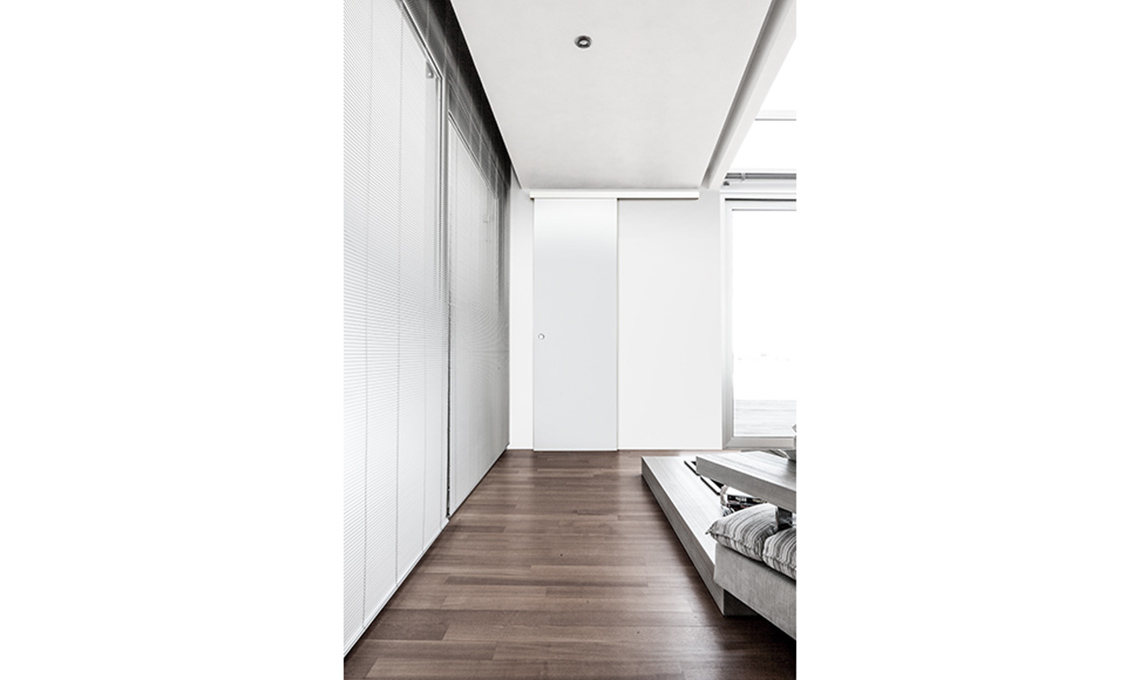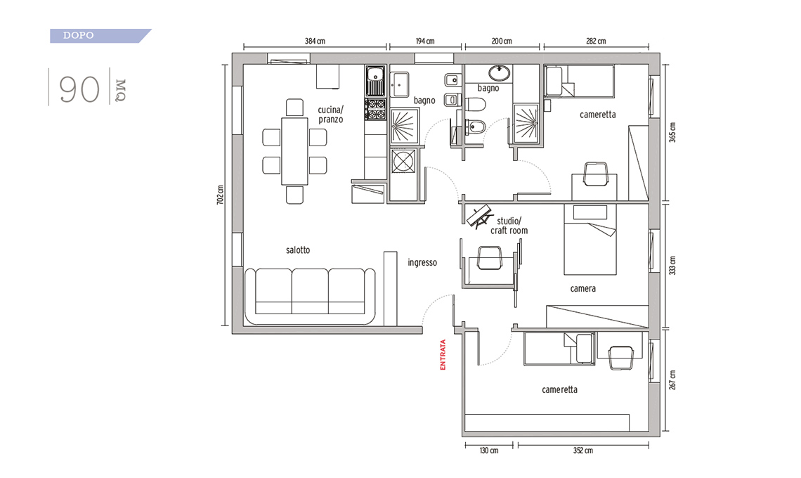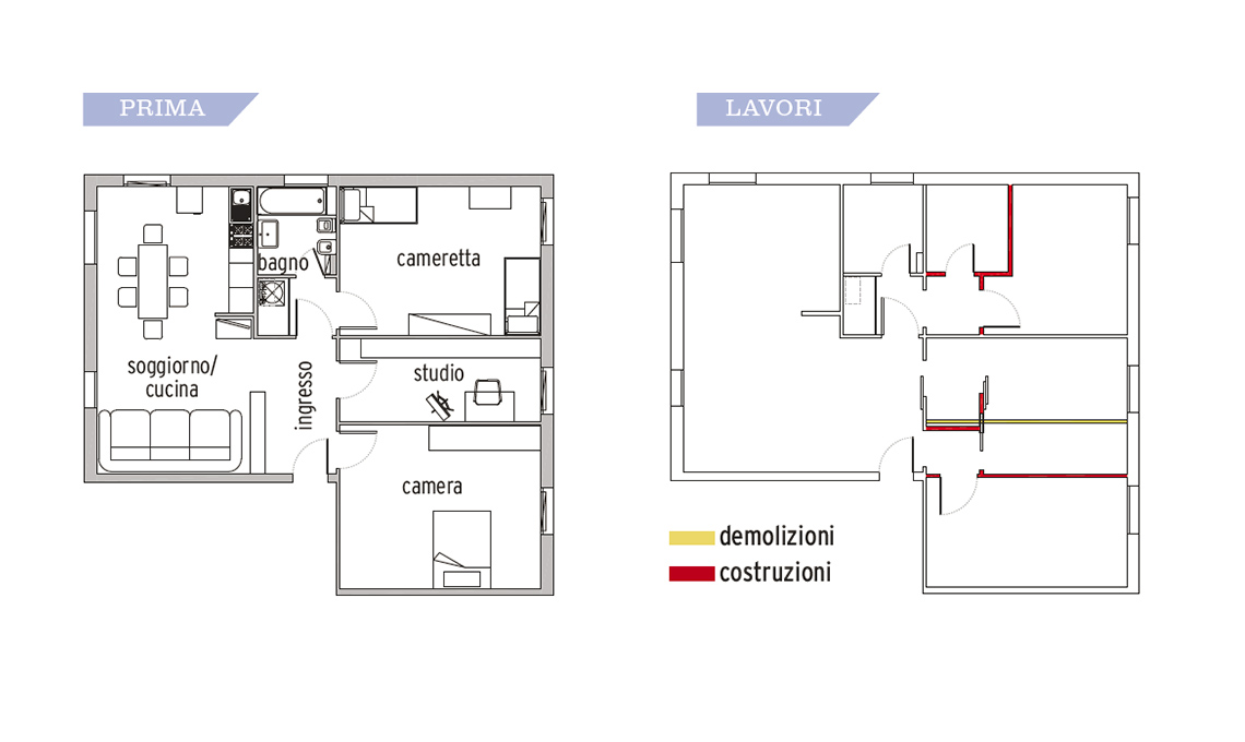 Per ridurre lavori e costi, il secondo bagno si ricava in una parte della ex cameretta, accanto a quello esistente.Vi si accede da un disimpegno e ospita anche un’armadiatura che serve da ripostiglio. In questo modo si possono sfruttare gli scarichi senza fare nuove tracce nel pavimento. Il vecchio studio, raddoppiato, diventa stanza matrimoniale con angolo studio/craft room chiuso da due porte scorrevoli in vetro. Infine, riducendo quella che era la camera padronale si ricava la stanza per il secondo figlio.