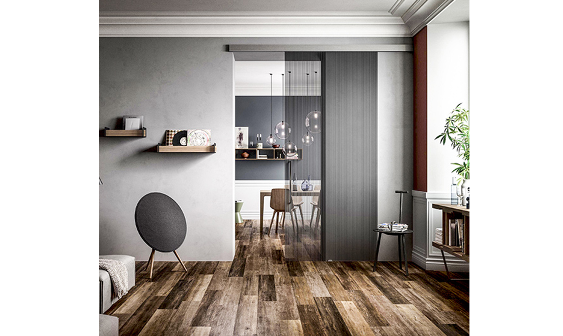 La craft room è chiusa da porte scorrevoli in vetro, che separano lasciando passare la luce. Il modello scelto è con binario esterno che non richiede lavori di muratura. Puoi scegliere il sistema Pinze a Vista per soluzioni esterno muro, con pannelli in vetro che garantisce la massima leggerezza e luminosità di Scrigno. Oppure il modello di Bertolotto con superficie trattata effetto legno evetro della porta Materik Phantom, con binario esterno ‘piatto’ semi a vista. Oppure la porta Epsilon, in versione scorrevole con porta in vetro bianco extra-chiaro e binario in alluminio argento di Cocif. Scenario Visio Strip in cristallo vedo-non vedo scorre su binario esterno a vista. Raggiunge i 290 cm di altezza ed è prodotta da FerreroLegno. La zona studio è decorato con la tappezzeria Helleborus di Farrow&Ball e sulle pareti, idropittura in giallo e grigio serie ColoreVivo di San Marco.