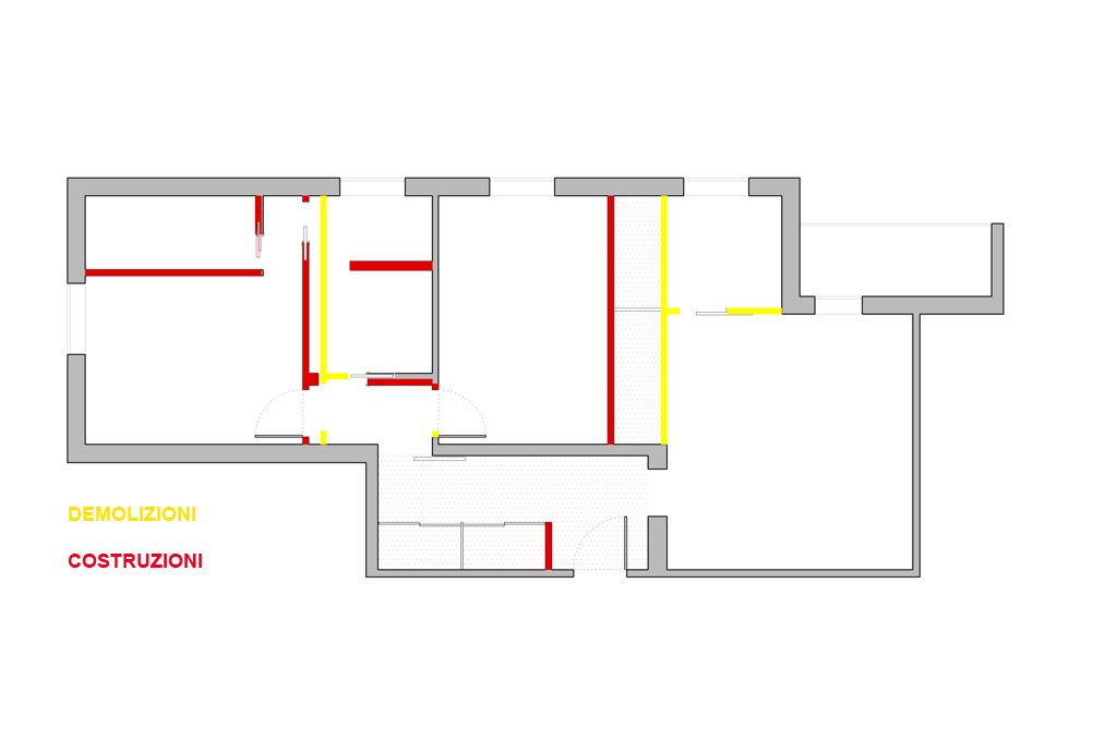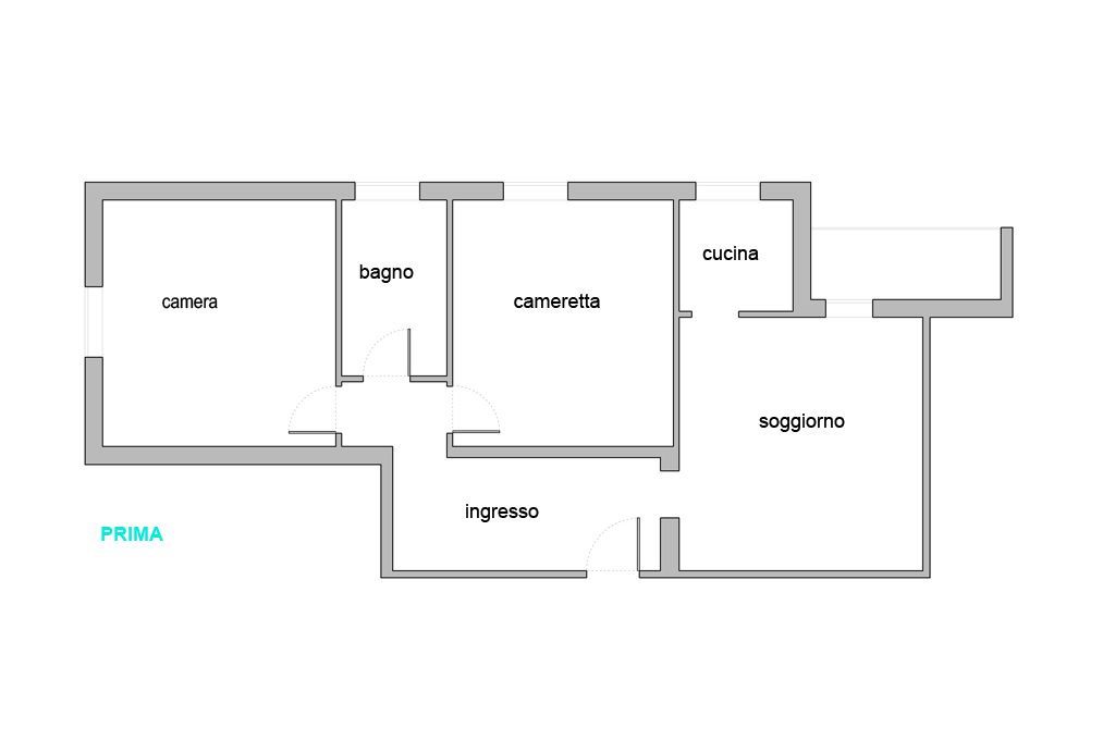Un classico trilocale: si vuole ricavare un secondo bagno, una zona lavanderia e aggiungere delle armadiature. La cucina, separata dal soggiorno è piccola, l'ingresso (non modificabile) molto grande e poco sfruttato.