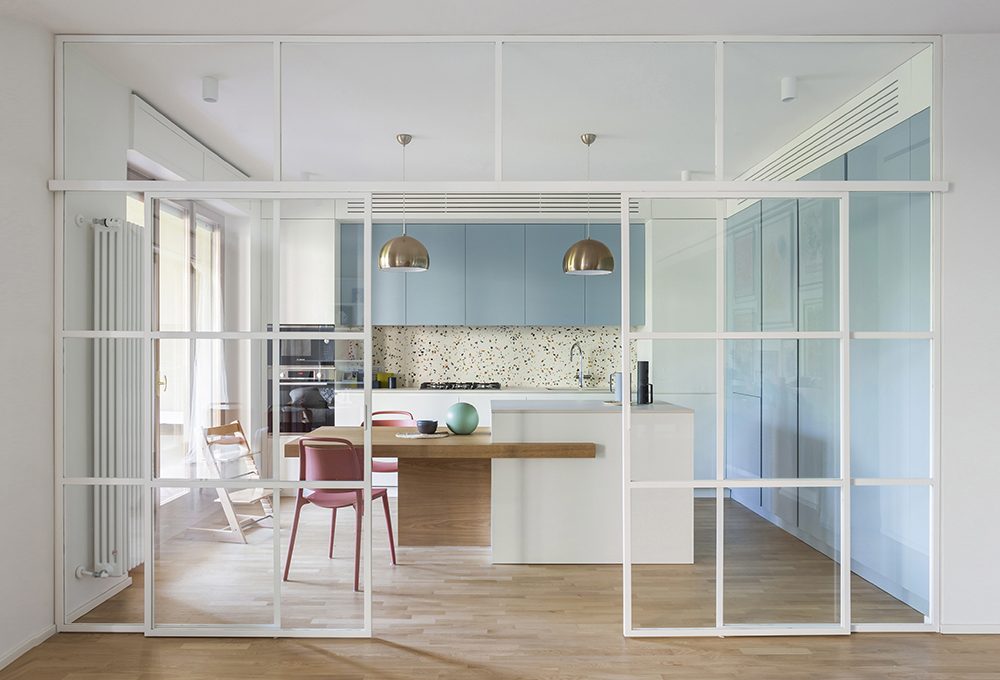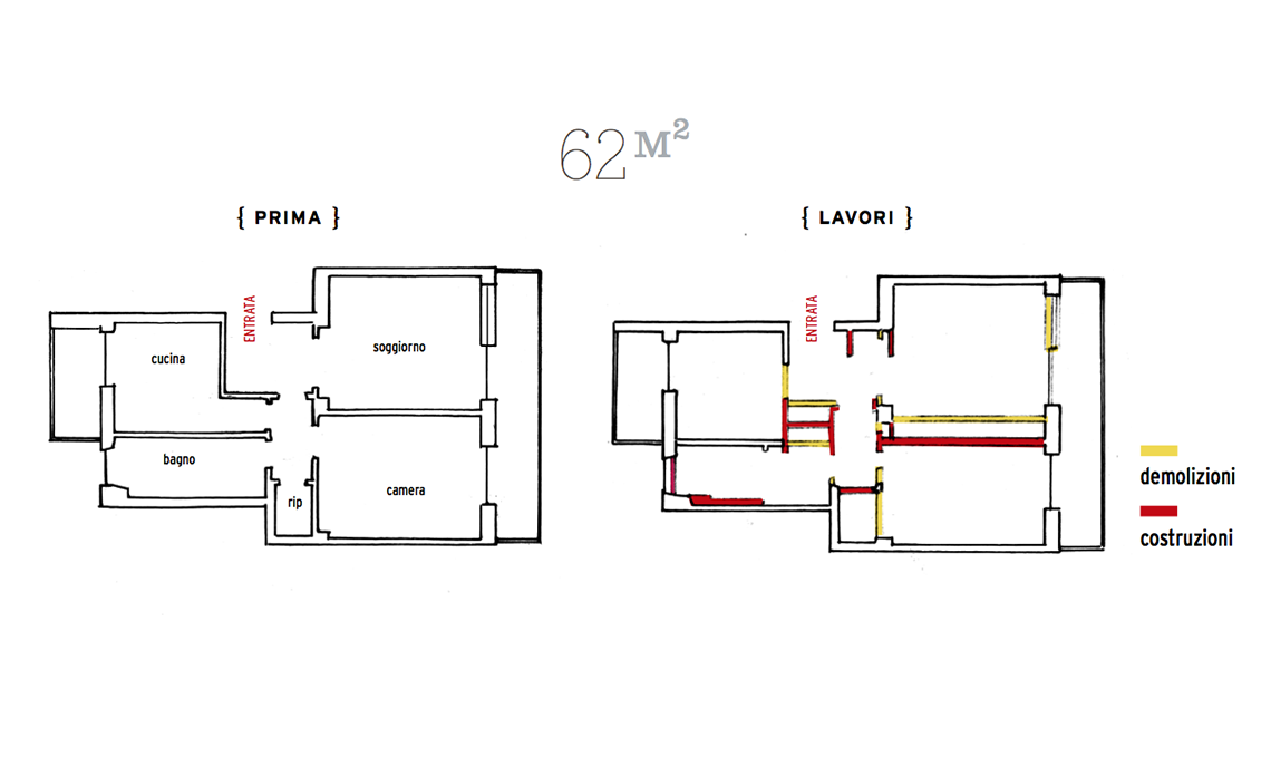 Il progetto prevede un intervento radicale che lascia in piedi soltanto la parete divisoria tra il bagno e l’ex cucina: è proprio in questo locale, dotato di balcone, che viene organizzata la cameretta del bimbo, a cui si accede direttamente dall’ingresso. Questo è stato ridimensionato e dotato di due nicchie nelle quali vengono ricavate zona studio e armadio per i cappotti (che, inoltre, scherma il salotto). Il tramezzo fra soggiorno e camera è stato spostato per dare più spazio al living, che ora contiene anche la cucina, organizzata in linea e completata da un tavolo rotondo e dalla zona relax. Qui al posto di due finestre è stata realizzata un’unica portafinestra ad ante scorrevoli. La camera padronale ha inglobato il volume del ripostiglio, che così è diventato una pratica cabina armadio chiusa da una struttura autoportante con porta scorrevole, che evita la creazione di ulteriori tramezzi. Nella parte iniziale del bagno è stata ricavata la zona lavanderia dentro una nicchia.