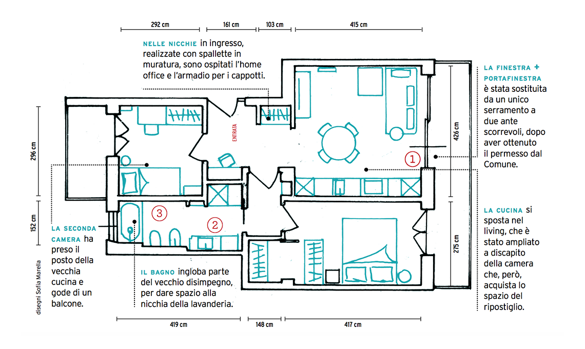 Ingrandito leggermente il soggiorno che ora accoglie la cucina, lo spazio di quest'ultima è diventato cameretta. Ed è bastato razionalizzare l'ingresso, per ricavare studio, lavanderia e cabina armadio!