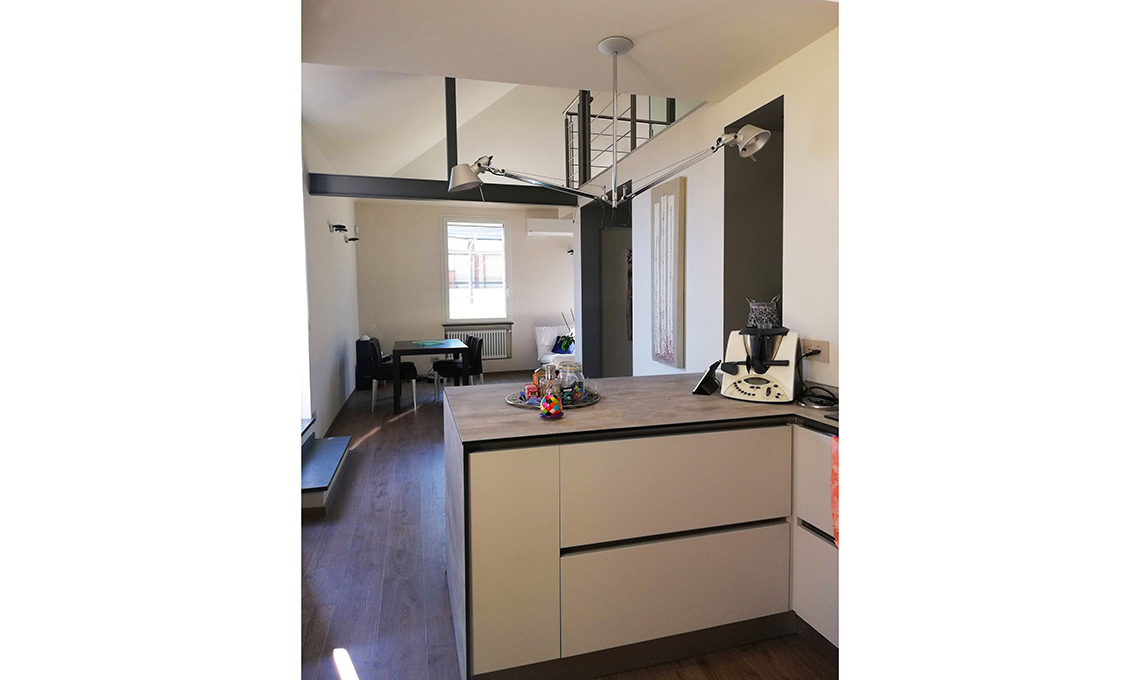 l proprietario della casa all’ultimo piano aveva l’esigenza di ingrandire l’appartamento per creare uno studio in casa (è un multimedia artist). Il sottotetto era inutilizzato e di sua proprietà, così l’architetto CFstyle Manuela Marconi ha proposto di recuperarlo: in pratica, demolendo i vecchi soffitti, l’altezza utile interna è diventata di cm 520 nel punto maggiore e 320 nel punto più basso, con un’altezza media di 440 cm.