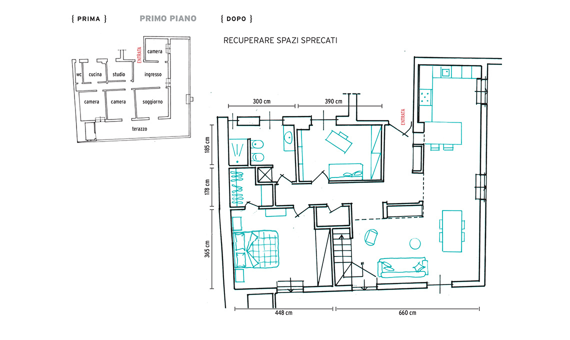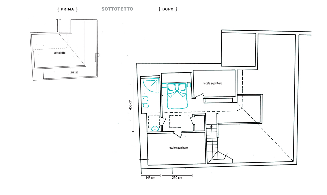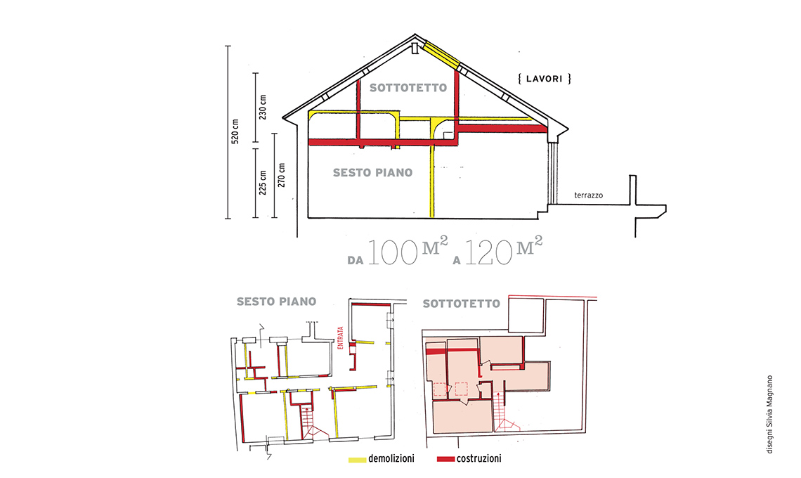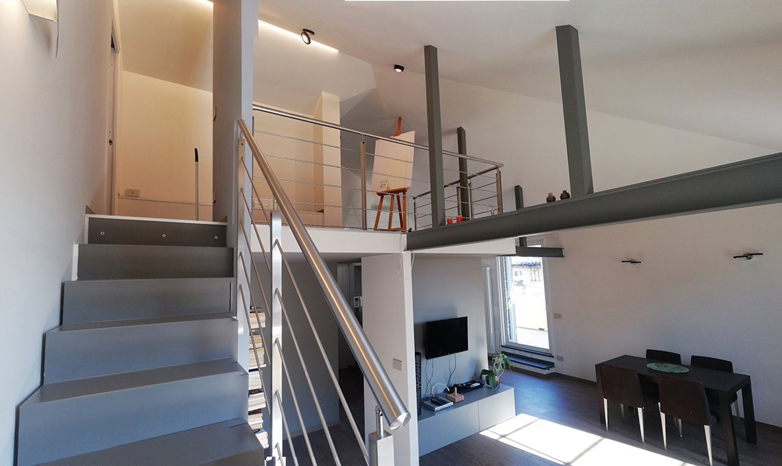 La soffitta inutilizzata si è rivelata preziosa. Per sfruttarla è stata abbassata la soletta che la separava dall'appartamento sottostante.