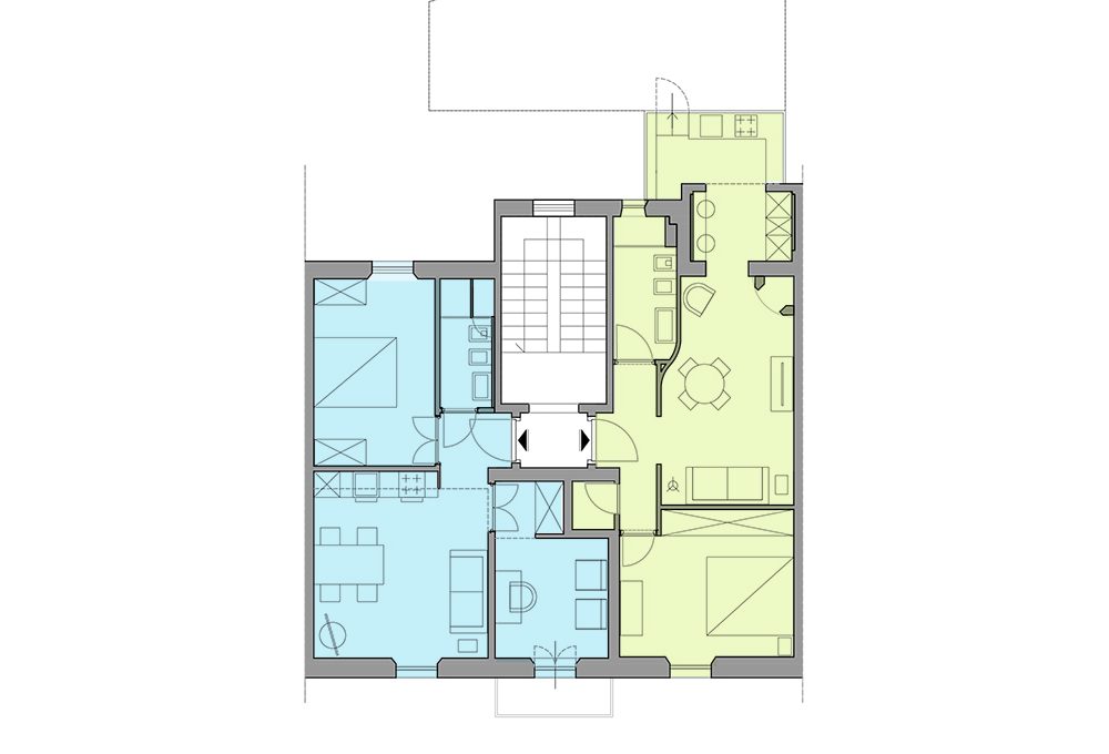 La disposizione delle camere da letto ai lati opposti della casa ha suggerito la divisione in due immobili, organizzati con soluzioni su misura.