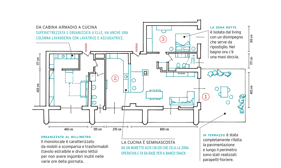 Tolto il tramezzo tra cucina e soggiorno, chiusa la porta che collegava il disimpegno alla camera principale (che aveva cabina e bagno) si dà forma al monolocale (è stato realizzato un ingresso separato dal pianerottolo) organizzato con arredi su misura, letto a scomparsa, un tavolo estensibile, cucina e bagni nuovi.