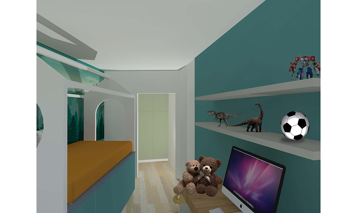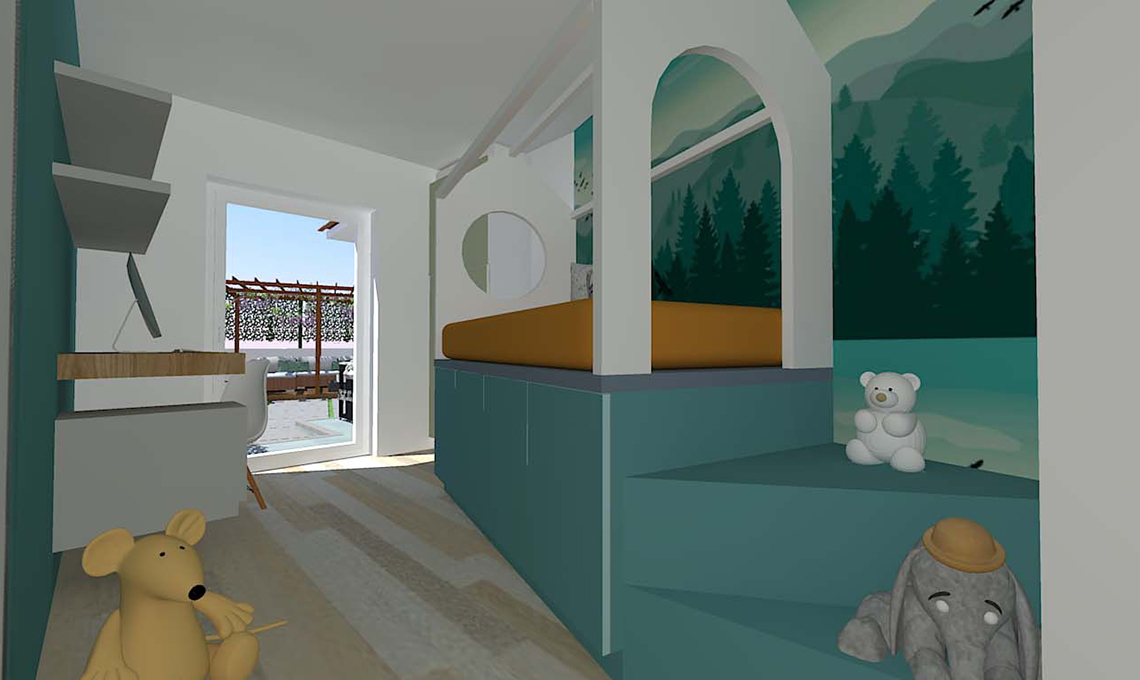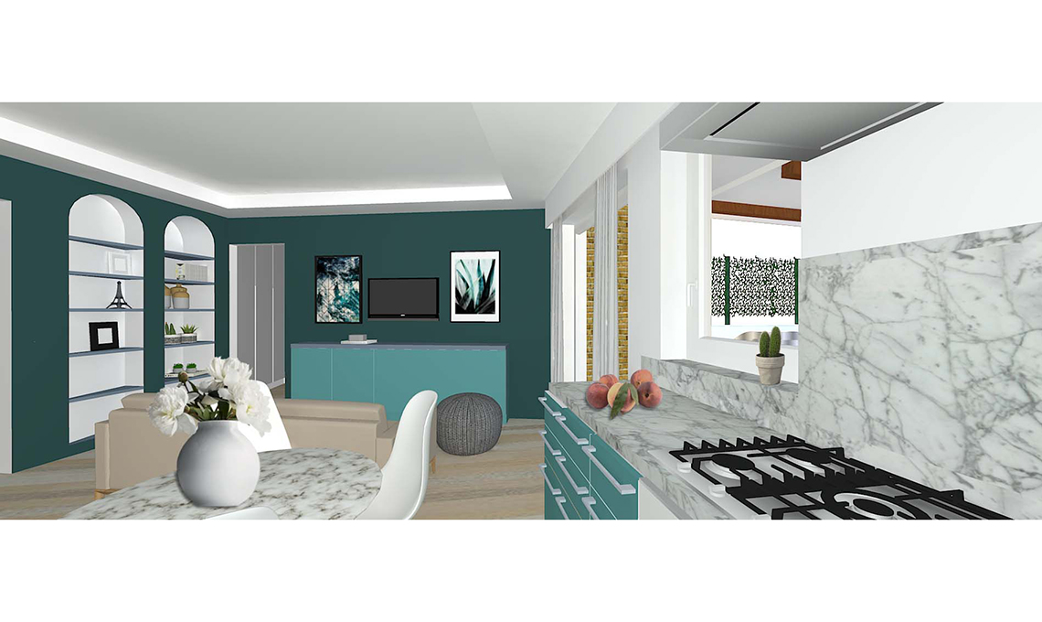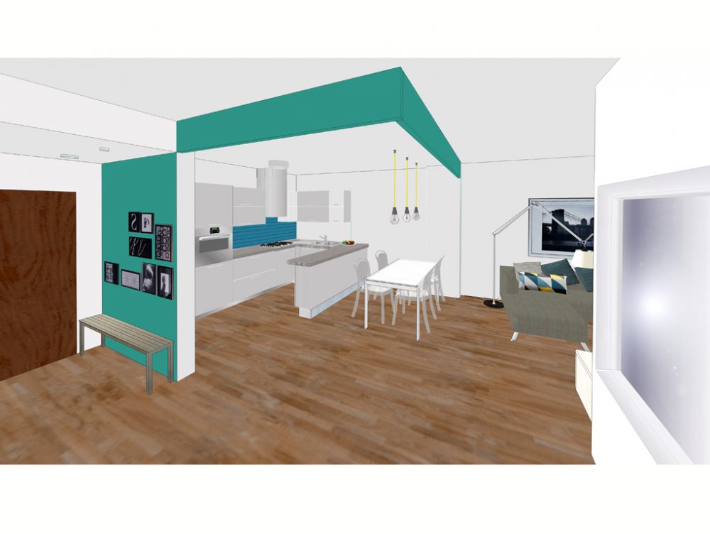 Abbattuti i tramezzi che definiscono la cucina, che ora sarà open sul soggiorno, si realizzano due pareti oblique in cartongesso per creare la cameretta di corrette dimensioni, senza penalizzare il living. Gli impianti sono soltanto modificati.