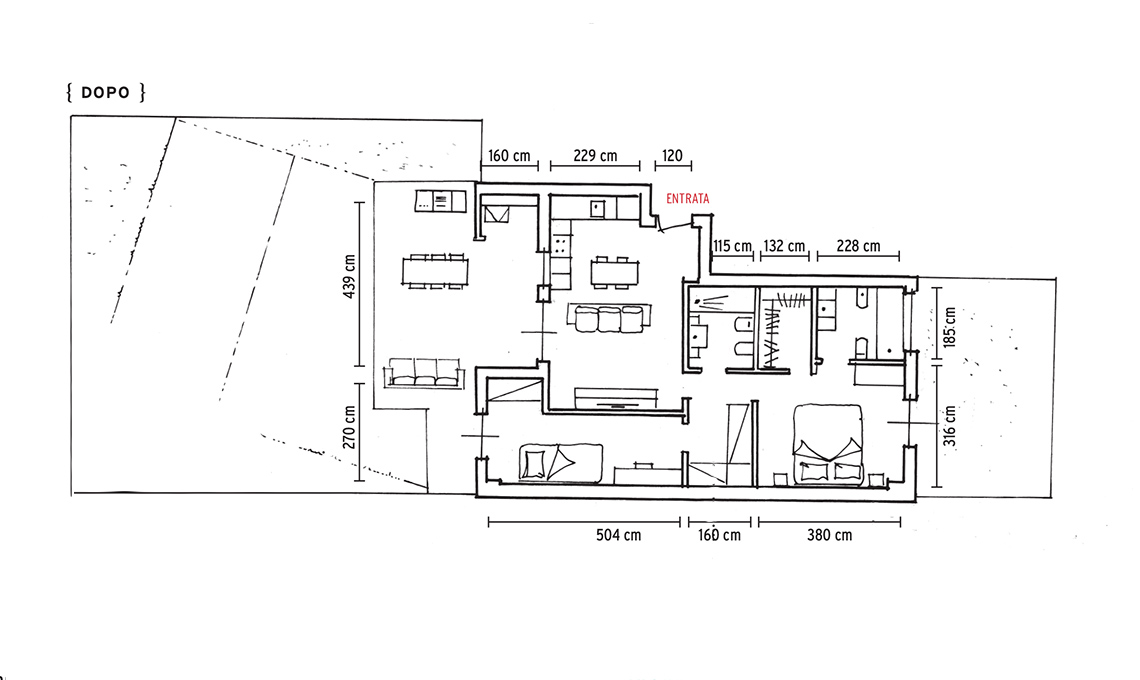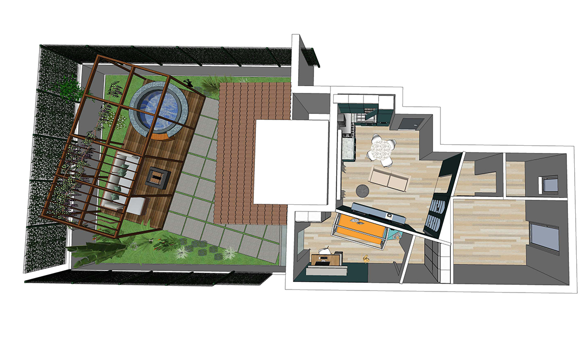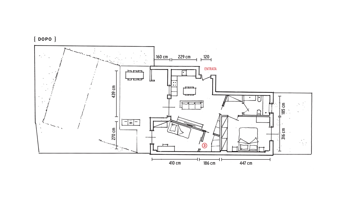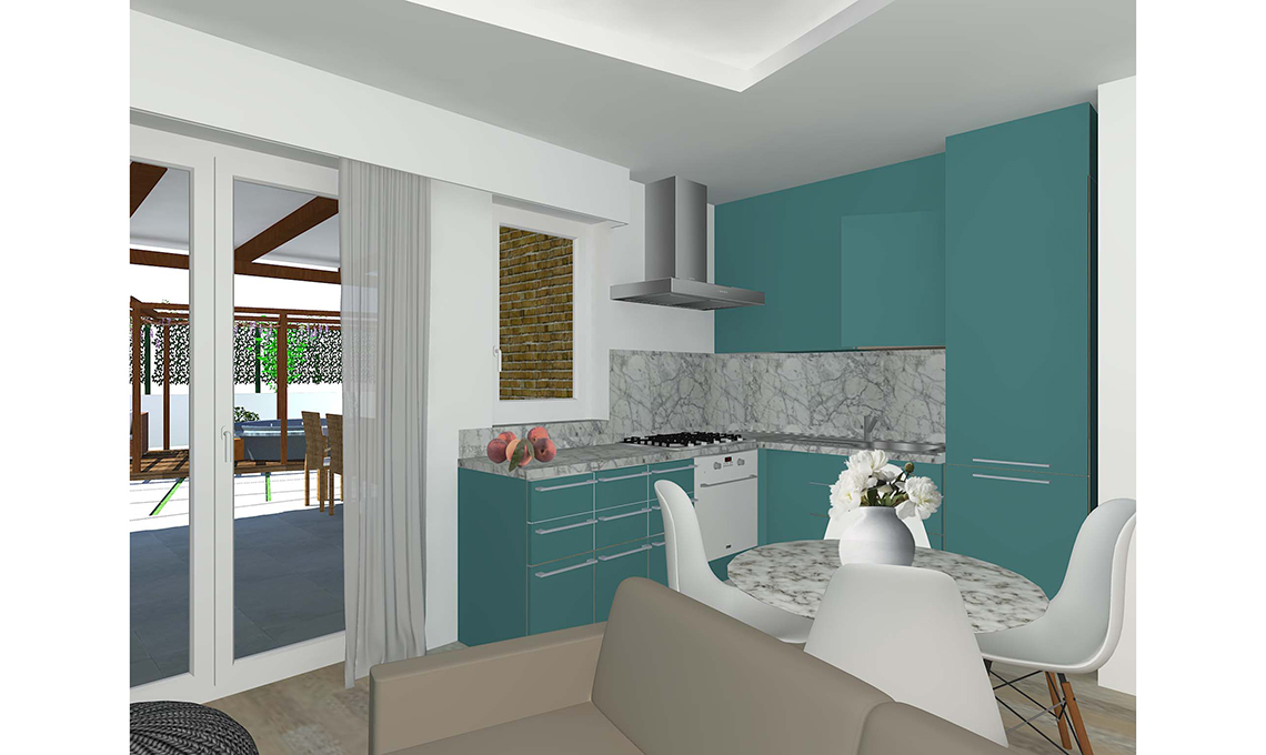 Vengono demoliti tutti i tramezzi e i pavimenti: la cucina si apre sul salotto, la cameretta prende una forma a elle preceduta da un’utile anticamera con armadi. Allargando leggermente il vecchio disimpegno, si ricavano il secondo bagno (cieco) e la cabina armadio della camera padronale, che adesso ha il bagno privato. Il dehors ospita una piccola cucina open air, un maxi tavolo e, in giardino, l’area relax.