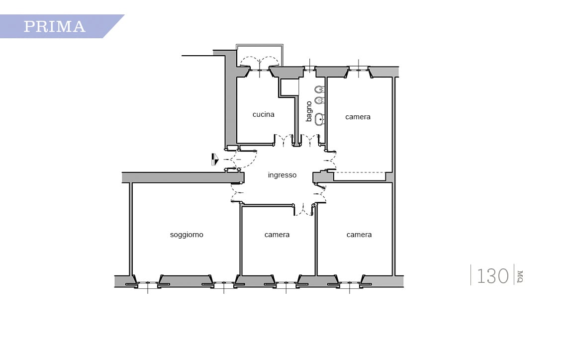Il committente vuole separare le zone notte e giorno, nonché creare un secondo bagno e una lavanderia. Servono anche uno studio dove ricevere i clienti e una cucina aperta sul soggiorno.