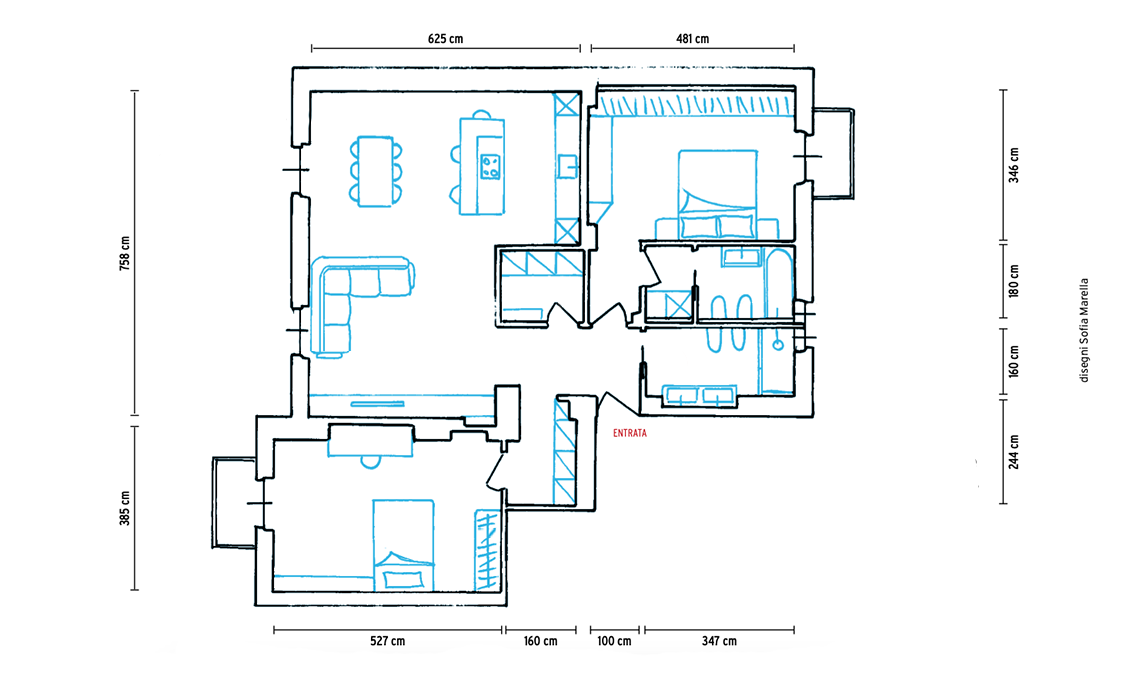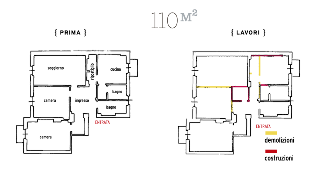 Un grande living con cucina che diventi il luogo più ‘da vivere’ dell’appartamento, due camere ampie e indipendenti (la figlia è adolescente e in questo modo presto potrà godere della giusta privacy e autonomia), due bagni più funzionali e disimpegni ridotti al minimo.