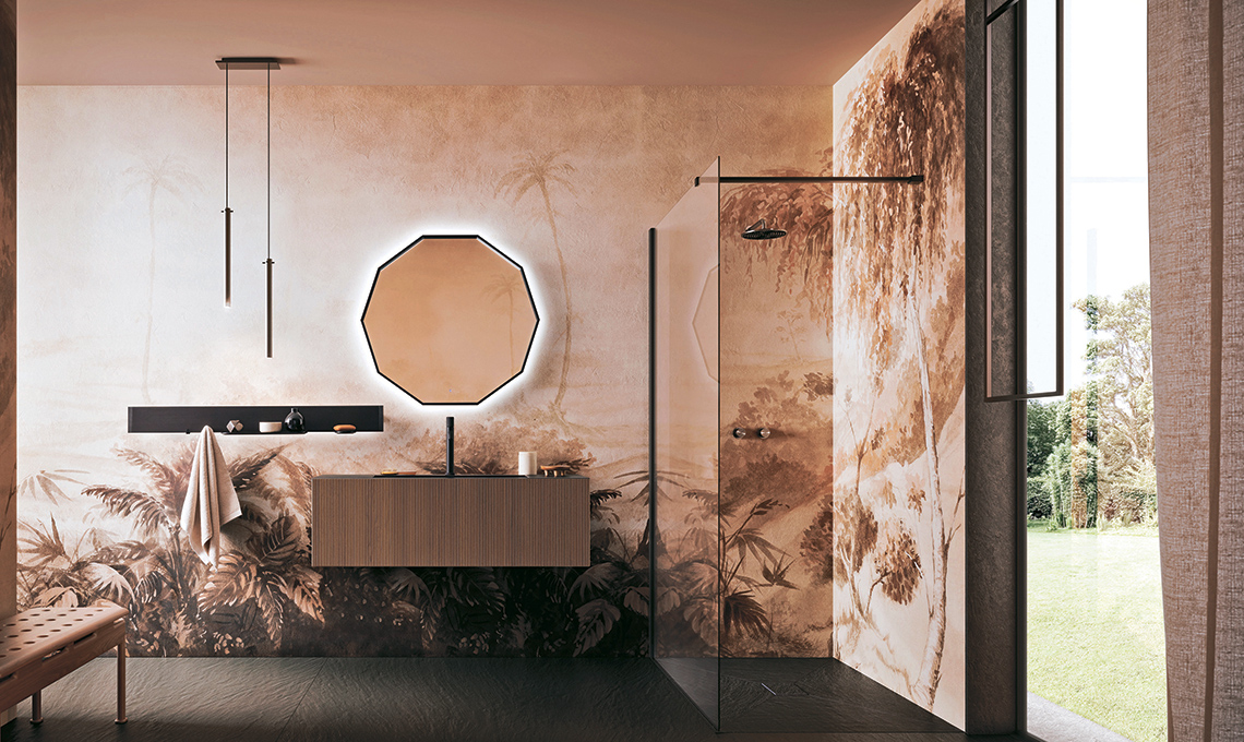 Mobile bagno Luxor sospeso con frontale in Rovere Millerighe Castoro, top in Laminam Ardesia Spacco Nero con lavabo integrato Plaza [Arbi Arredobagno].