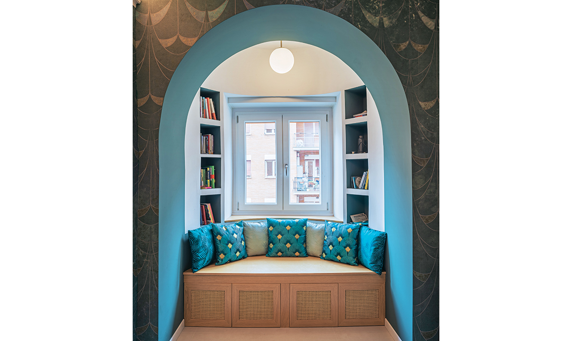 Da questo, parte l’arco che scende fino al pilastro di sinistra. Sotto la finestra è stata costruita una panca contenitiva. Infine, è stata realizzata la parete curva che ‘incornicia’ la finestra: parte dai pilastri e ospita 2 nicchie simmetriche