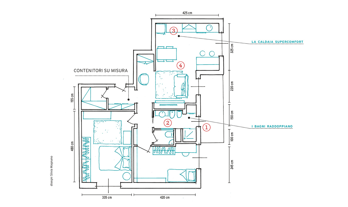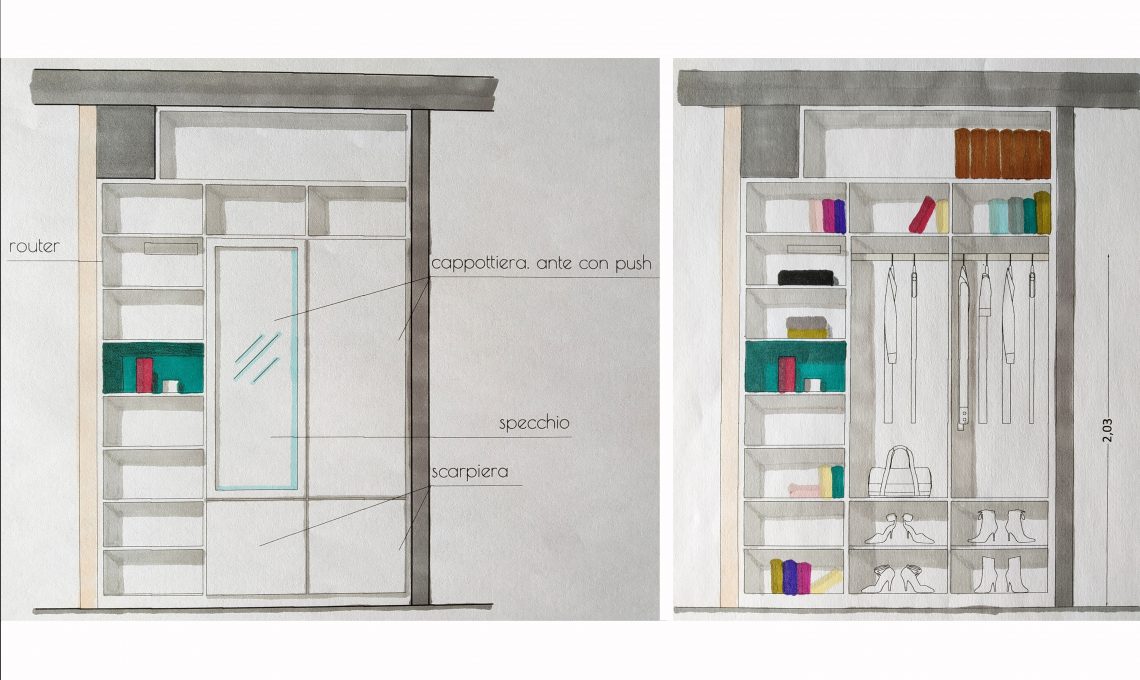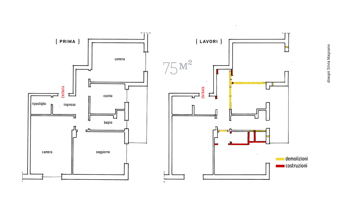 Eliminati i tramezzi tra corridoio, cucina e camera, è stato creato un unico ambiente giorno con accesso al terrazzo, cucina a vista, pranzo e un angolo lettura nella nicchia generata dalla presenza di una parete non abbattibile perché ospita gli impianti. Il bagno esistente è stato rifatto sostituendo la vasca con la doccia: così c’è spazio per lavatrice e asciugatrice; sfruttando i nuovi impianti si è aggiunto, lì accanto, un secondo mini-servizio con lavabo e vaso. Al posto dell’ex soggiorno c’è ora la cameretta. Tutte le nicchie sono state sfruttate con librerie e amadiature progettate ad hoc.