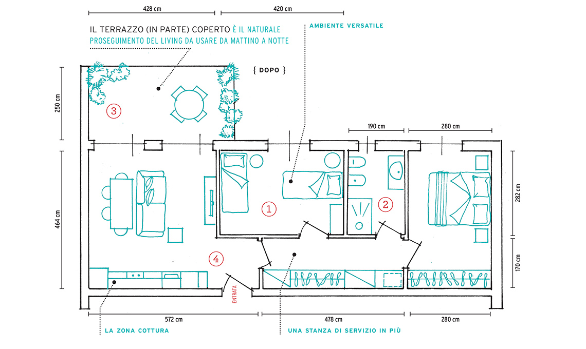 Ridimensionato il living, ora con cucina a vista, si ricava la stanza per i figli. Il corridoio diventa cabina armadio e il terrazzo si sfrutta h24.