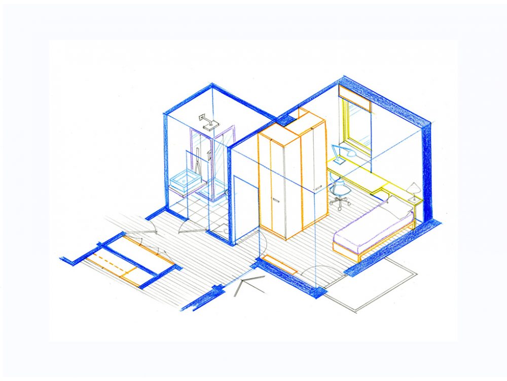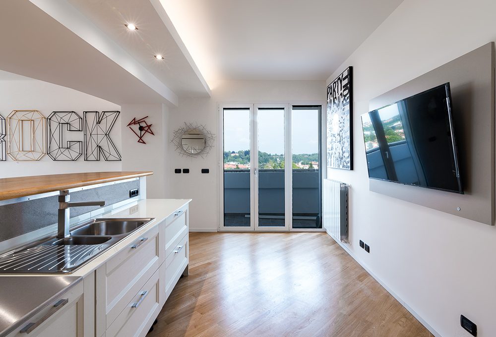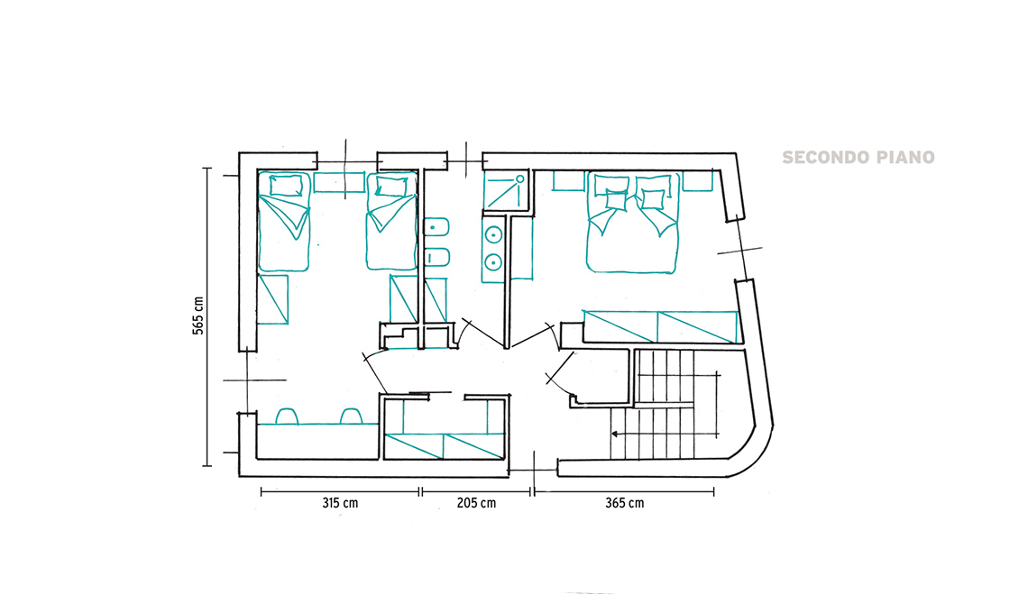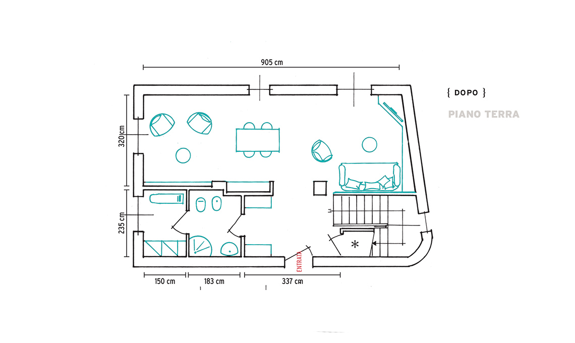 A piano terra si entrava direttamente in soggiorno e c’era un mini bagno: prima di tutto è stata realizzata una quinta per isolare l’ingresso e il servizio è stato ampliato e sdoppiato per accogliere la lavanderia/stireria con accesso anche dall’esterno. Il primo piano, prima con maxi cucina più bagno e due ripostigli, ora contiene cucina abitabile, sala da pranzo con angolo relax/tv, camera ospiti e un bagno con vasca. L’ultimo livello, che aveva 3 camere da letto (le due singole ai limiti di legge di 9 mq) e un bagno piccolo, è stato riprogettato per avere una grande camera per i figli, cabina armadio, un ampio bagno e la stanza matrimoniale.