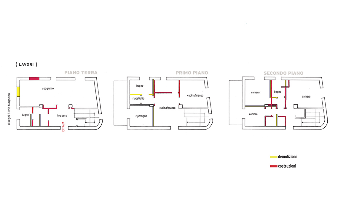 Villetta su 3 piani, poco più di 40 mq per piano. Ogni livello è stato riprogettato con soluzioni ad hoc ma da copiare, anche in un mono o bilocale.