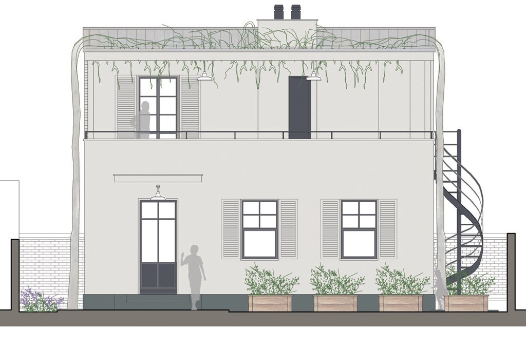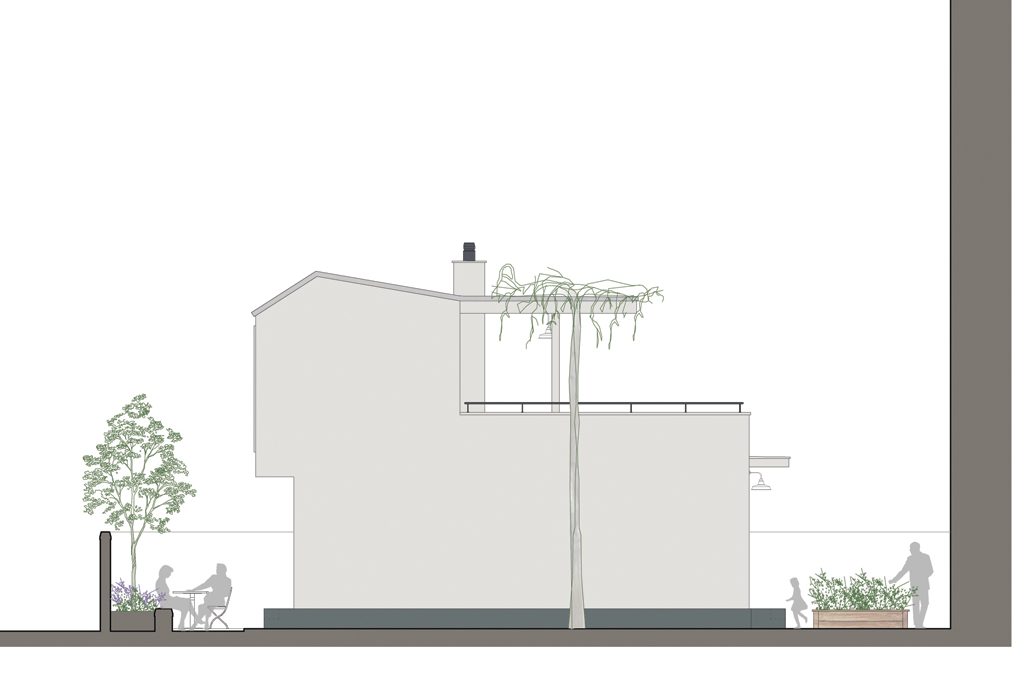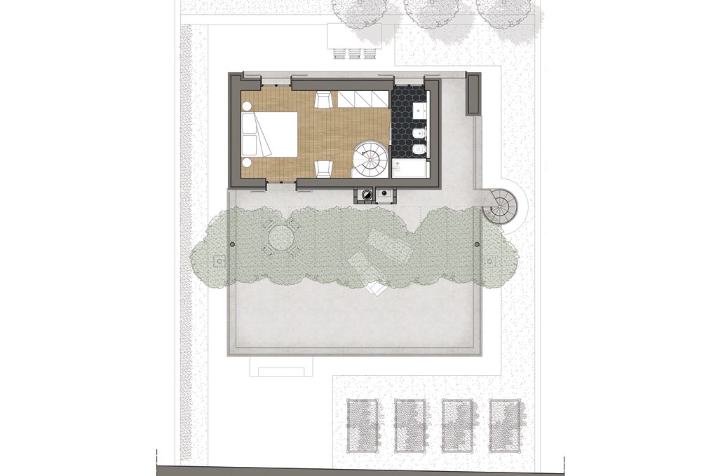 La nostra lettrice Anna ha contattato l’architetto Cf Style Francesca Pierucci per farsi fare un progetto per una casa che vorrebbe acquistare: un’abitazione indipendente (tipo ex casa del portinaio) all’interno di un cortile condominiale. Le esigenze di Anna? Spostare soggiorno e cucina sul lato opposto a quello dello stato attuale, in modo che si possano affacciare sul giardino privato, e creare un piano in più da adibire a zona ospiti accessibile anche dal grande terrazzo che verrebbe a sostituire il tetto preesistente: Il tutto circondato da pergolati e zone a verde con piante da frutto e aromatiche.