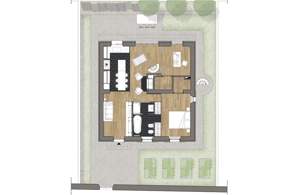 Il progetto del piano terra: studio, cucina e living sono open space; la camera padronale ha armadioe cabina, il bagno sia la vasca da centro stanza sia la doccia.