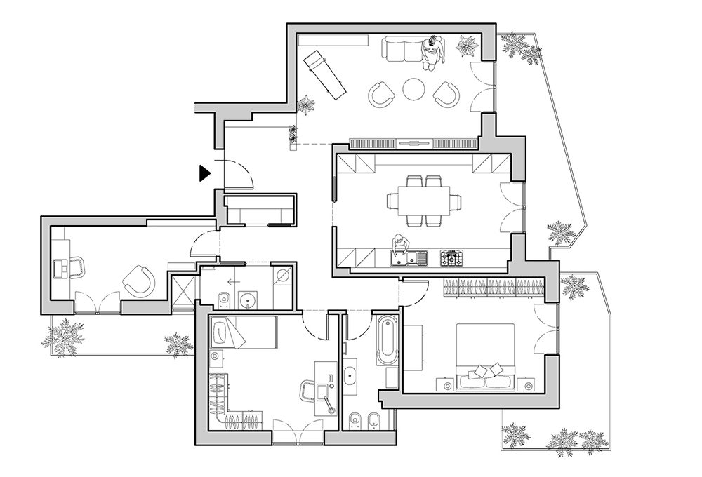 Innanziutto, si abbatte la parete che separa soggiorno e camera padronale, in modo da dar vita a un open space con cucina a vista, pranzo e salotto disposti in sequenza. Viene murata la porta che dal disimpegno portava alla stanza matrimoniale. Quella che era la seconda camera viene ampliata a discapito del bagno che, però, guadagna spazio con una nicchia ricavata dal soggiorno, in cui trovano posto doccia e colonna lavanderia. La cameretta per il figlio viene spostata dove prima c’era la cucina e viene dotata di bagno en suite ricavato nell’ex ripostiglio finestrato. Per collegare questo servizio con la braga di scarico esistente è stato necessario creare una sopraelevazione del pavimento di circa 10 cm in tutta la casa (l’altezza interna utile quindi diventa di 292 cm, nel rispetto della normativa, che ne prevede 270 nelle zone con permanenza di persone – soggiorno, cucina e camere – e 240 nei bagni e negli spazi di passaggio). Nel disimpegno, invece, è stato realizzato un controsoffitto alto 30 cm in cui alloggiano i canali dell’impianto di condizionamento. Sotto il pavimento sono stati annegati anche i pannelli per il riscaldamento radiante.
