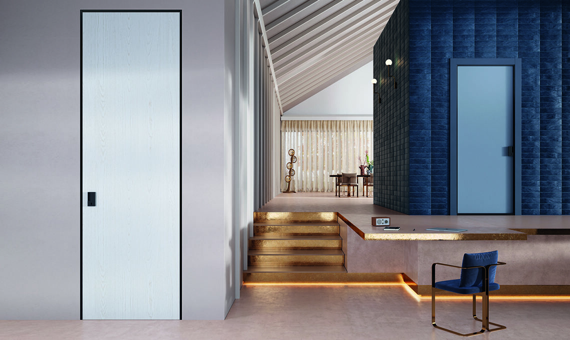 scorrevole, qui con telaio Concept: ha finitura Iride che esalta le venature del frassino spazzolato a effetto ultraopaco. Iride utilizza vernici a base d’acqua, con