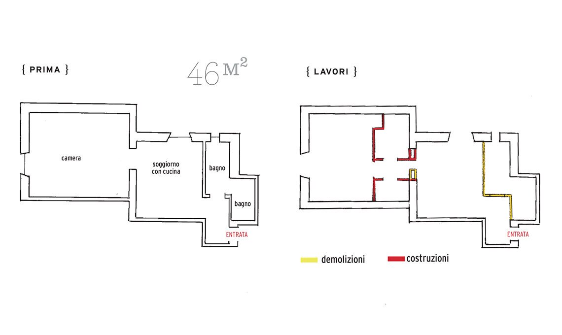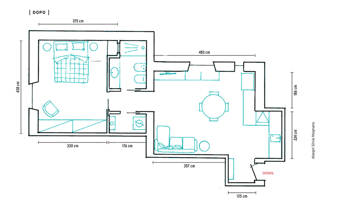 Living troppo piccolo e camera da letto troppo grande: la pianta di questo mini appartamento è stata rivoluzionata, ricavando stanze più vivibili, anche in pochi metri quadrati.