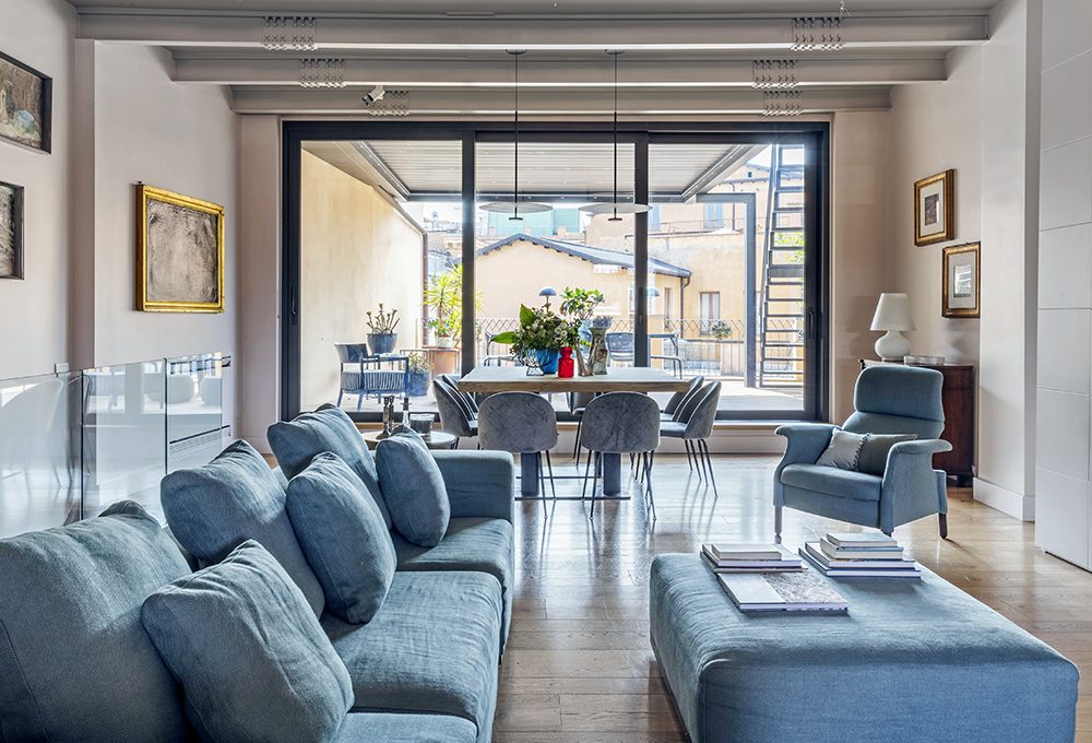 La scelta proposta dall’architetto è stata di invertire le zone notte e giorno, spostando soggiorno e cucina nella parte più distante dall’ingresso ma con affaccio sia sul terrazzo sia sul balcone. Il nuovo living, ora con cucina a vista, si raggiunge percorrendo il corridoio che arriva dall’ingresso e sul quale si affacciano prima gli ambienti notte. Lo si vede comunque subito, entrando, grazie a una porta completamente vetrata che rende immediato l’orientamento e lascia passare la luce che entra dagli spazi aperti.