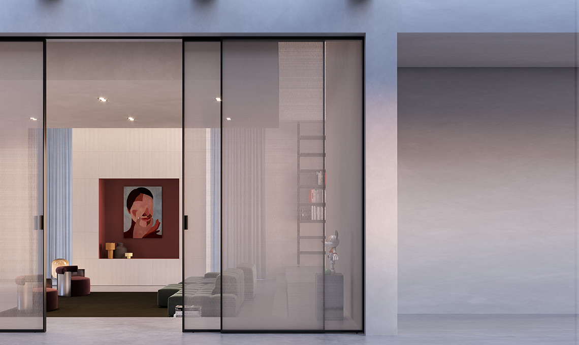 Porta scorrevole Scenario Delineo in vetro, nella versione con