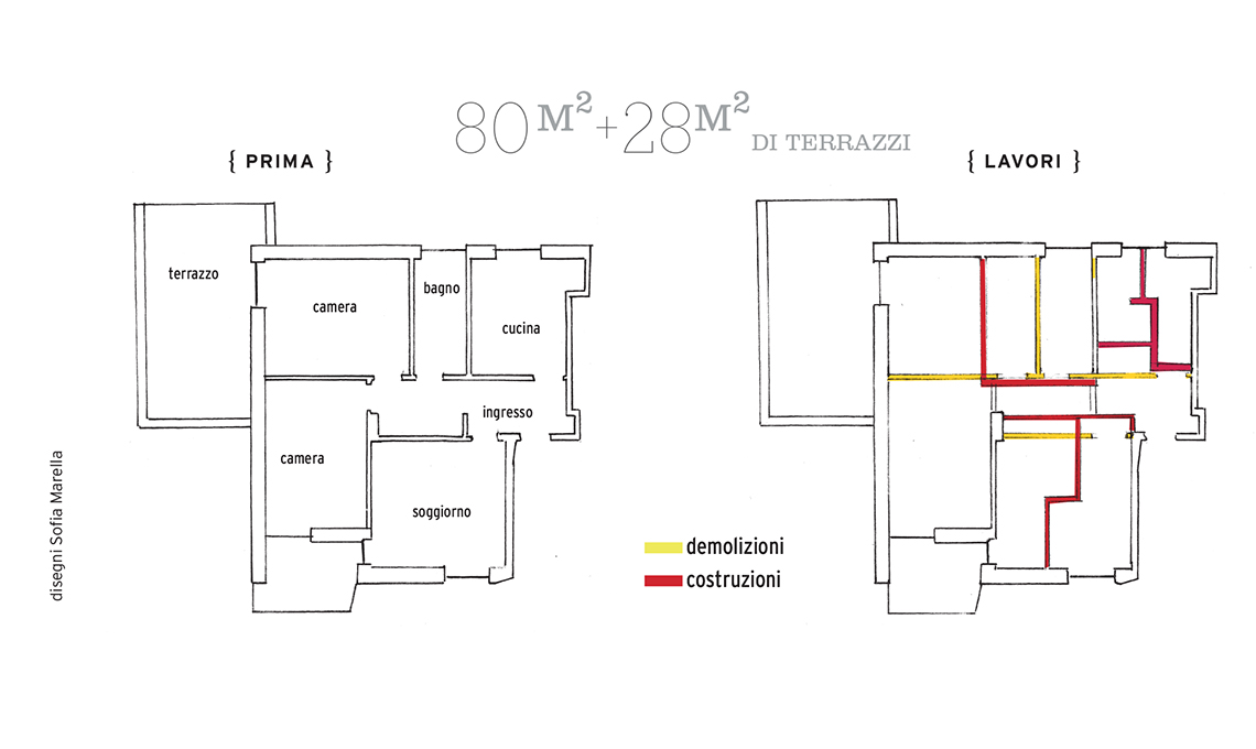 La distribuzione più classica: zona giorno all'ingresso, zona notte in fondo. Rivedendola completamente, adesso è possibile godere al massimo del terrazzo, prima accessibile solo dalla camera matrimoniale.