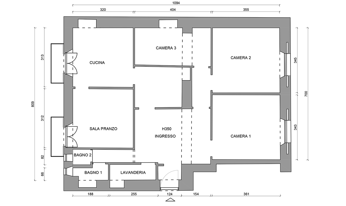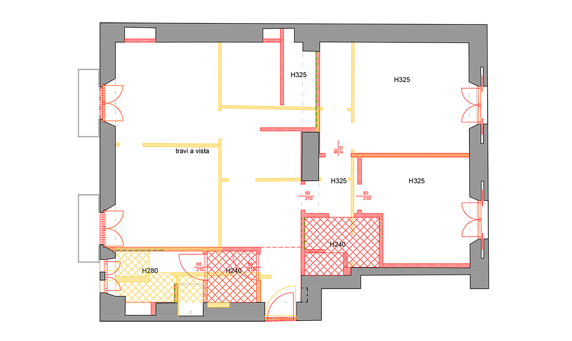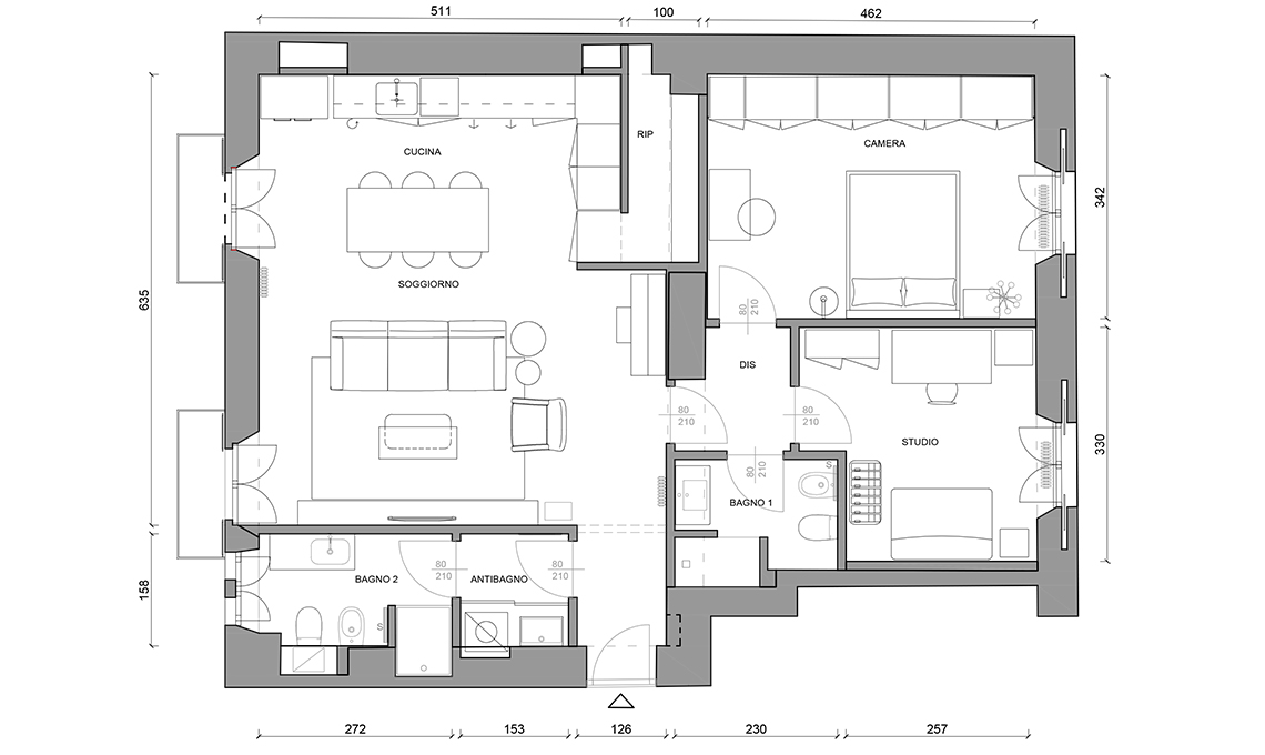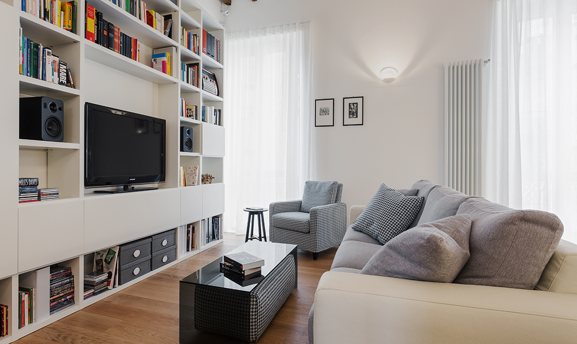- Dato che l'appartamento era strutturato in tanti piccoli ambienti separati, sono state demolite tutte le partizioni interne (pilastro centrale a parte), ed è stata realizzata un'ampia zona giorno a sinistra dell'ingresso: si incontra dapprima l'area relax e, in fondo, il pranzo e la cucina a vista.