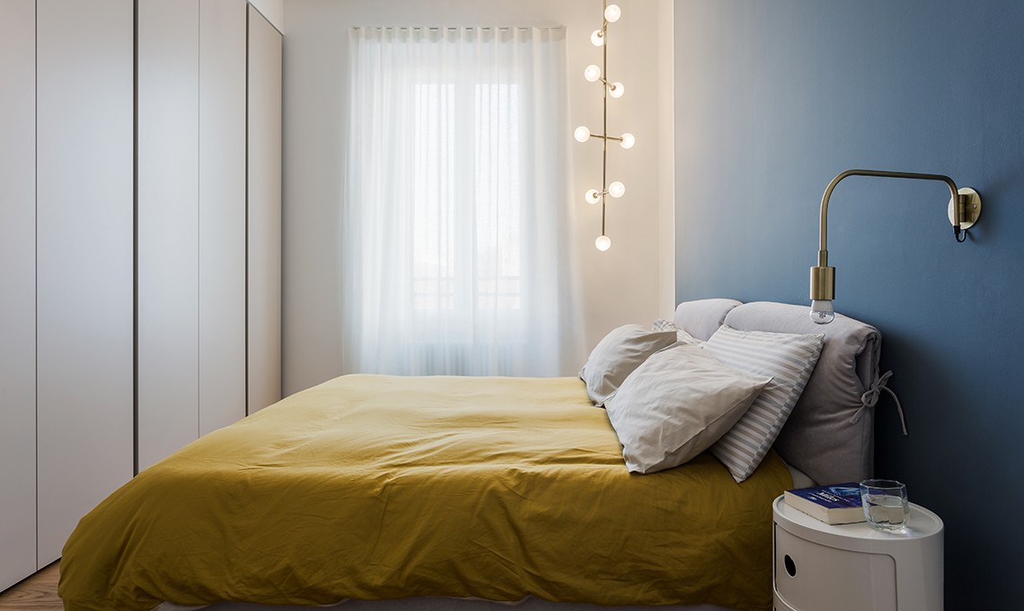 - La camera matrimoniale ha una piccola zona studio e una grande armadiatura a tutta parete ed è caratterizzata dalla parete blu alla quale è appoggiata la testata del letto. Tocchi vintage e scintillanti sono dati dalle lampade con diffusori a sfera e struttura in ottone.