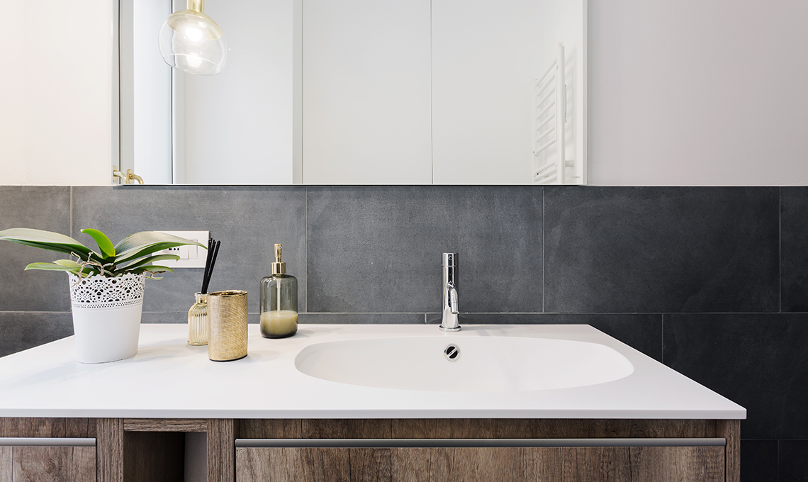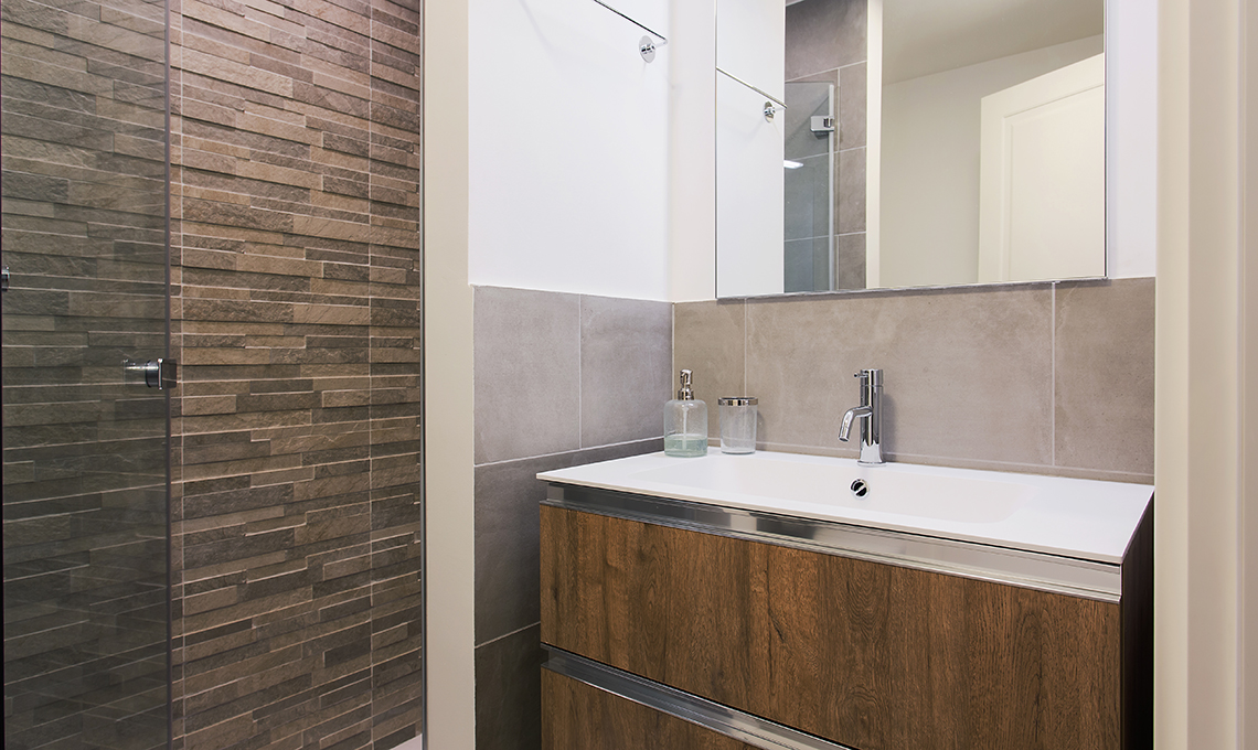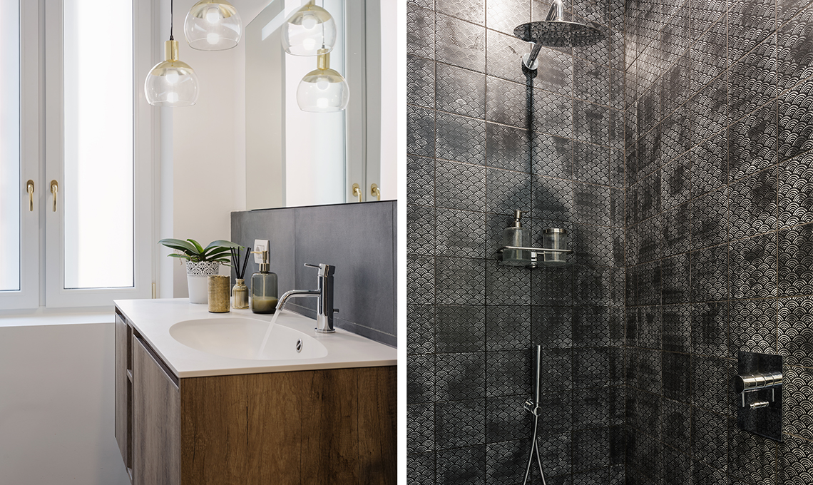 - In entrambi i bagni si è voluto giocare con texture e pattern insoliti sulle superfici verticali: in quello accanto all'ingresso (che è preceduto da una zona lavanderia) l'interno della doccia è rivestita con piastrelle dal sapore vintage a palmette; il bagno della zona notte, invece, ha una maxi doccia, parzialmente incassata, rivestita in grès a listello effetto pietra 3D.