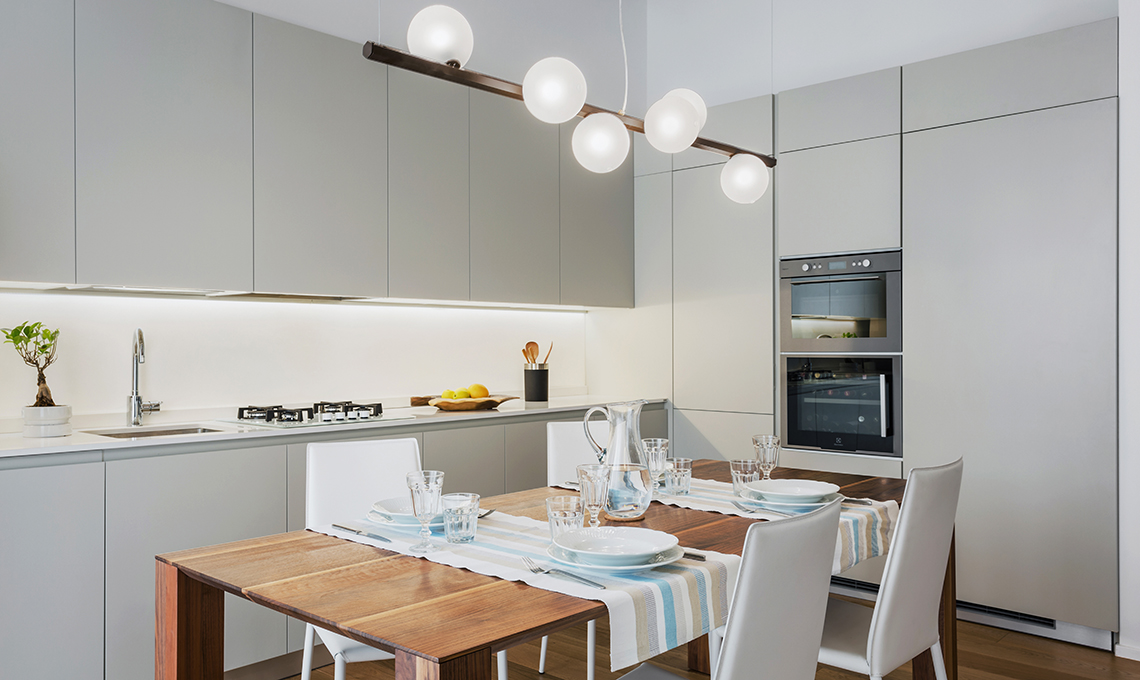 - La cucina è organizzata a 'elle' con la zona operativa sulla parete maggiore e due colonne dispensa e forni sul lato corto. Qui una 'porta' realizzata nello stesso materiale e colore delle ante della cucina consente di accedere al ripostiglio/dispensa che si trova, dunque, tra la cucina e la camera da letto padronale.