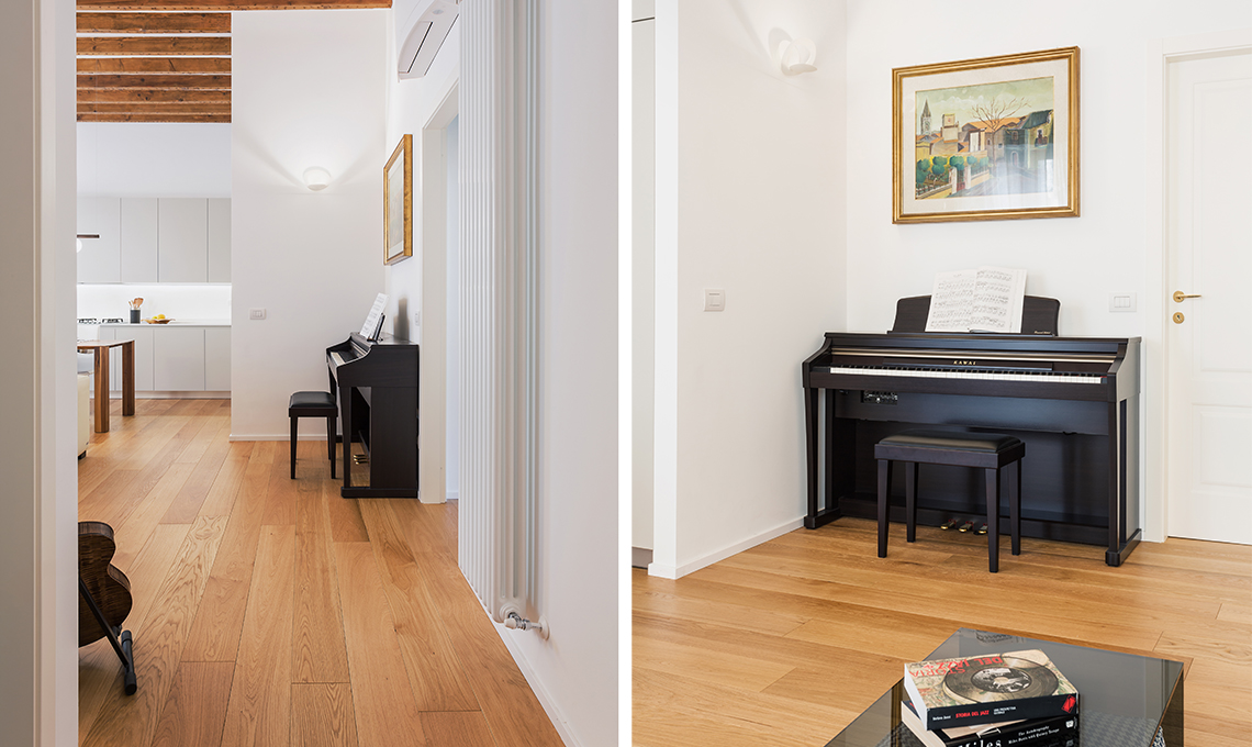 In pratica la ristrutturazione è stata totale ed è partita dal risanamento strutturale dei solai, la rimozione dei soffitti che ha messo in luce la struttura a travi a vista in legno e il totale rifacimento degli impianti.