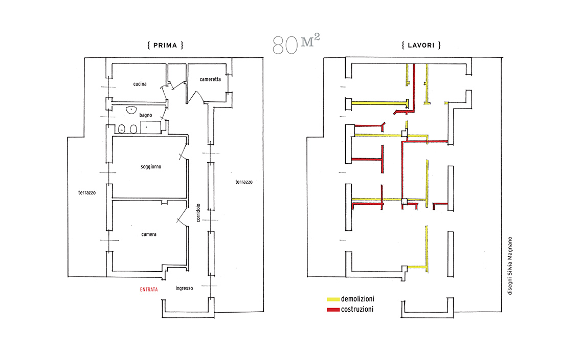 Prima di tutto gli architetti hanno eliminato l’ingresso ‘chiuso’e il lungo corridoio sul quale si affacciavano da un lato le piccole stanze e dall’altro il maxi balcone: in questo modo è stato possibile disporre i vari ambienti in modo che sfruttassero il doppio affaccio.