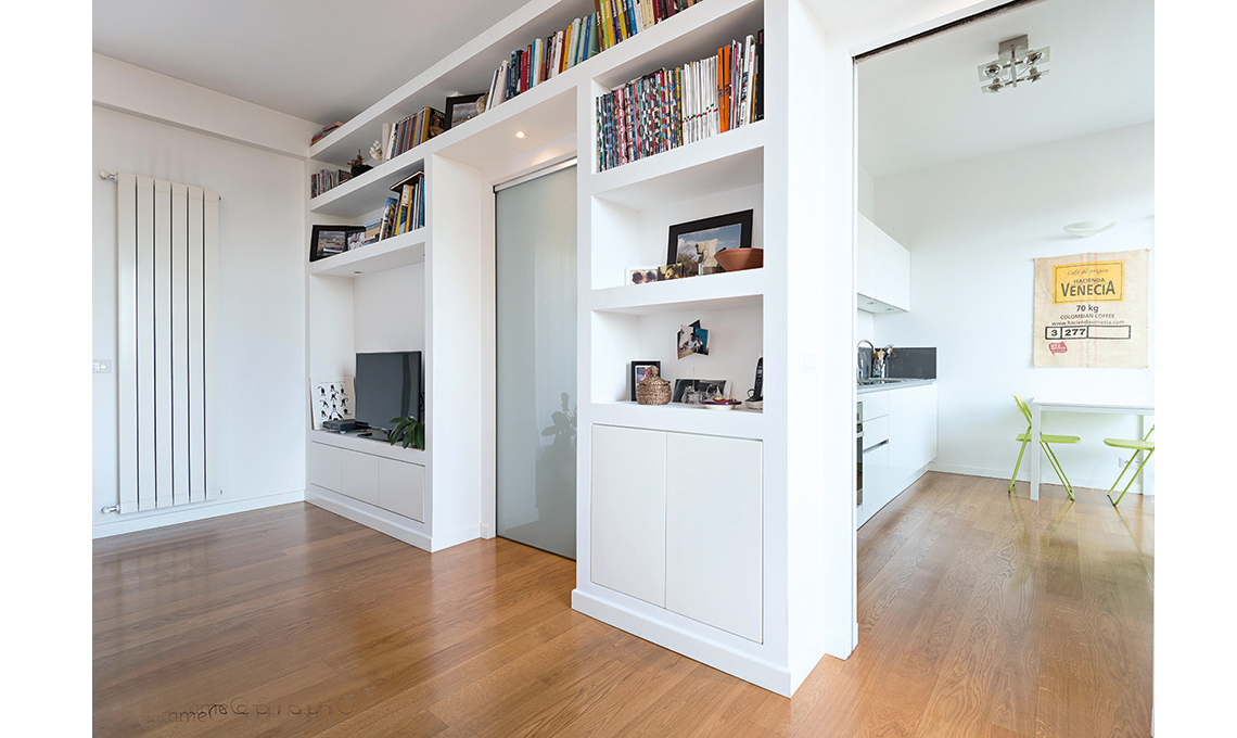 Spazio ai contenitori: nell’ingresso è stato ricavato un armadio a tutta altezza nella nicchia dietro la porta; la parete tra living, cucina e zona notte ospita una libreria in cartongesso che ingloba due porte scorrevoli in vetro.