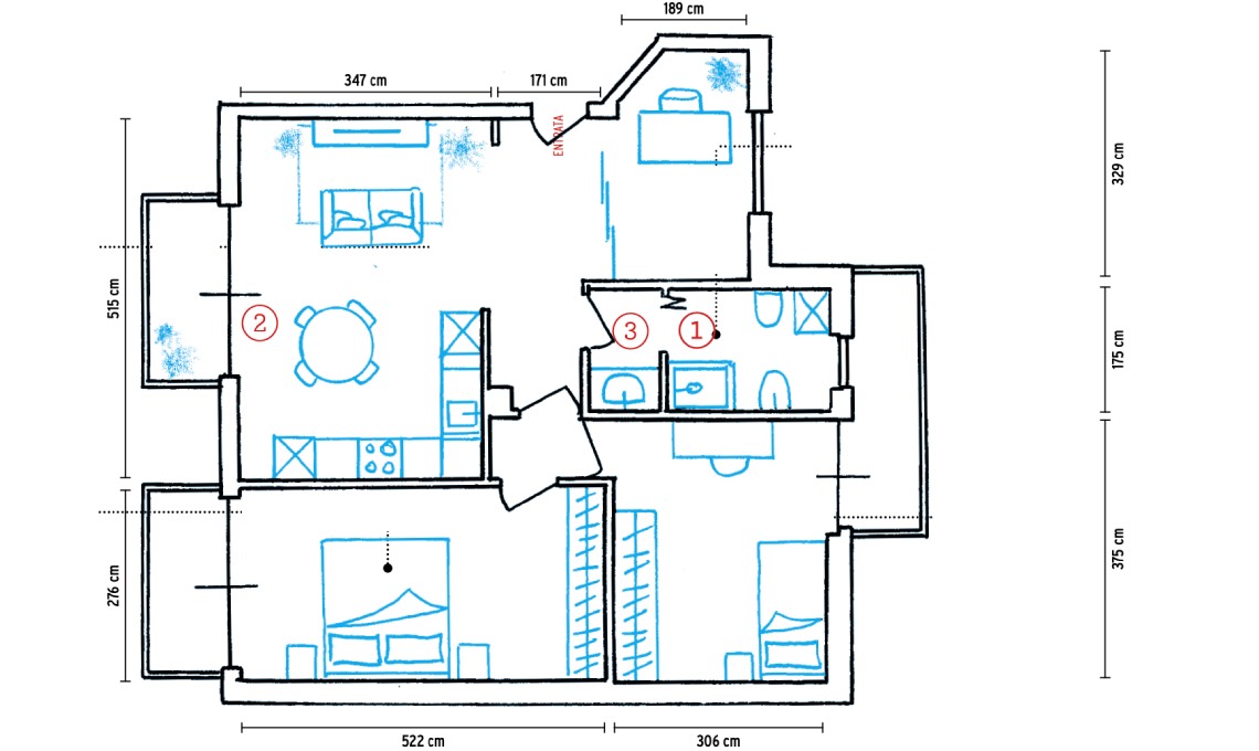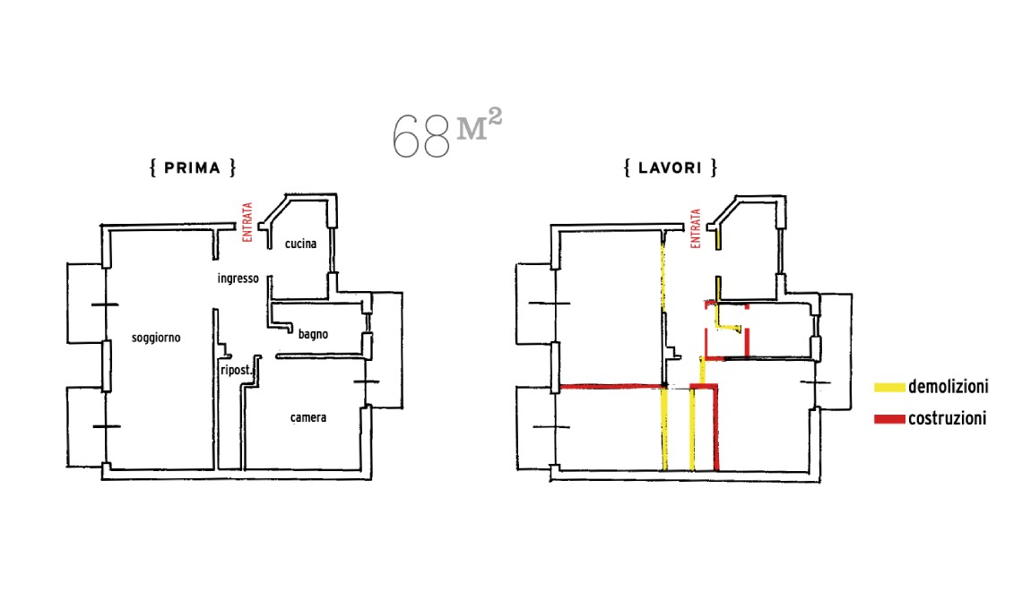 In cerca di un appartamento da ristrutturare e rivendere, Armando si imbatte in un bilocale i cui spazi erano stati disegnati in modo poco funzionale, con un grande soggiorno servito da un ingresso enorme a discapito di cucina e camera matrimoniale fin troppo piccole e un ripostiglio inutilizzabile tanto è stretto.