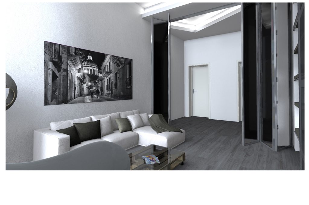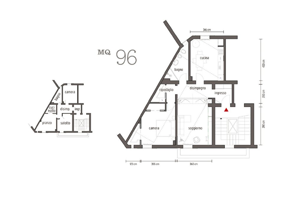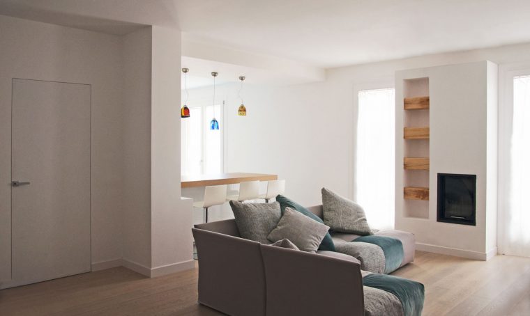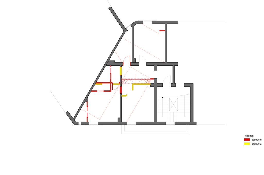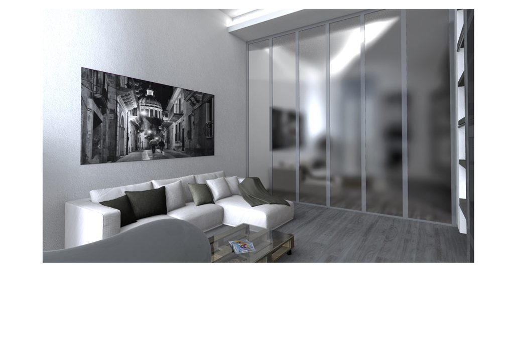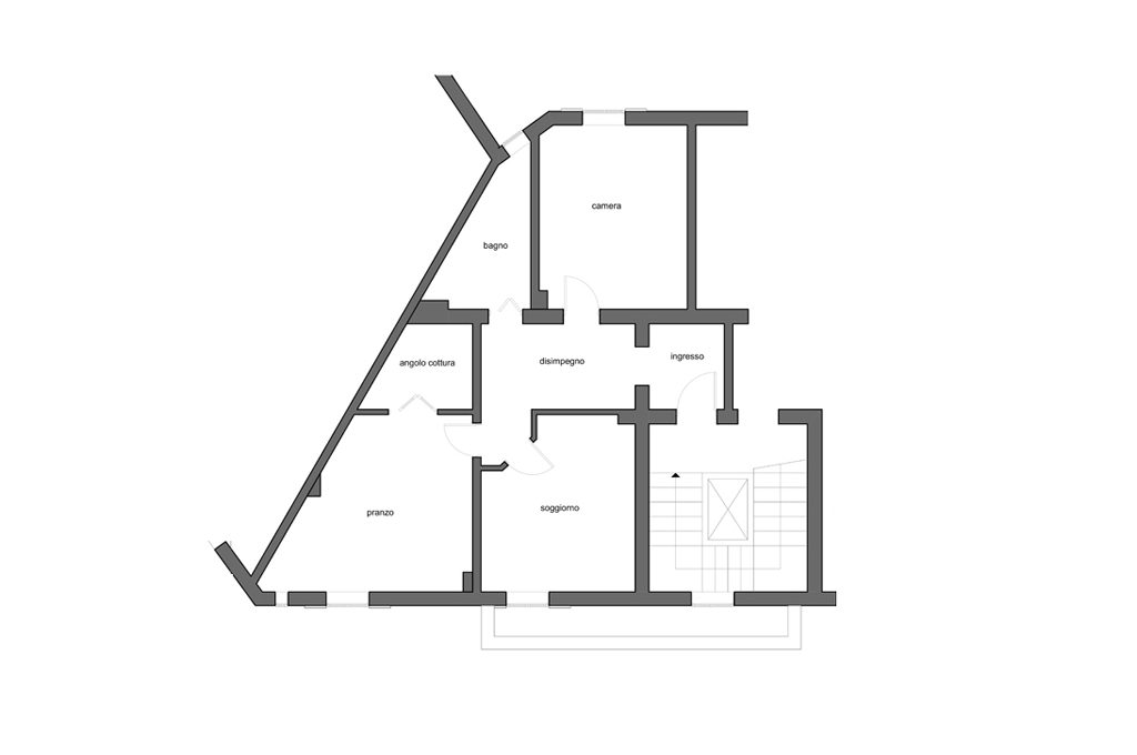 L’appartamento, in stato di totale abbandono, aveva la zona giorno divisa in due stanze (salotto e pranzo con cucinotto), un grande disimpegno, la camera matrimoniale e il bagno. In più, sia il servizio sia il pranzo hanno una delle pareti inclinata che dà una forma trapezoidale ai locali. La proposta dell'architetto Tona prevede che pranzo e camera si scambino di posto: la stanza da letto, ora, è ridimensionata e completa di due grandi armadi a muro. Come secondo step l'architetto ha suggerito di abbattere la parete fra salotto e disimpegno: così si dà luogo a un locale più ampio, direttamente collegato con la cucina-pranzo (molto più grande di prima), ma isolabile dal resto della casa grazie a una grande porta a libro in metallo e vetro satinato che dona privacy agli ospiti che dormono sul divano letto. Infine, la parete inclinata ha suggerito l’andamento di una serie di ribassamenti del soffitto nei quali è inserita l’illuminazione diffusa a led che, così, rimane nascosta.