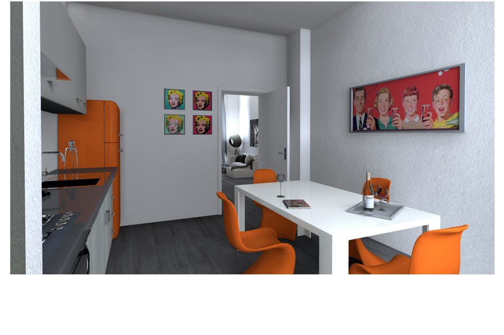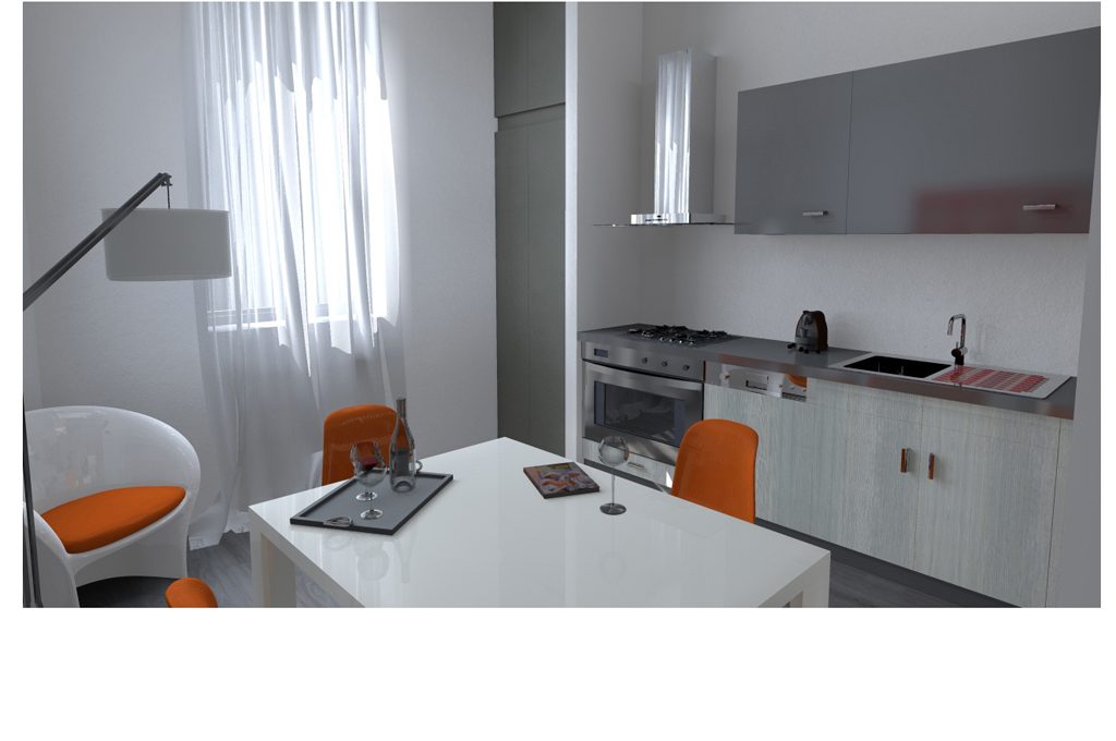 Posta dove prima c’era la camera da letto, la cucina ora risulta molto più ampia di prima, tant’è che ospita anche un maxi-tavolo da pranzo per 8 persone. Per non appesantire l’ambiente vengono proposti mobili bianchi come il tavolo in mdf e le basi con frontali in legno tinto avorio, più top e pensili in laminato grigio chiaro.