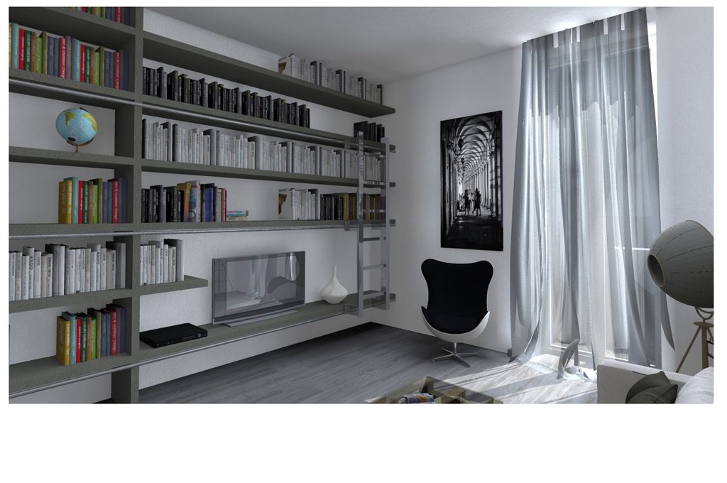 La parete davanti al divano è stata attrezzata con una maxilibreria a tutta altezza, importante ma leggera perché realizzata in laccato grigio perla. Disegnata dall’architetto Tona, è completa di scala metallica scorrevole, per raggiungere i ripiani più in alto, e di mensola per tv e decoder.