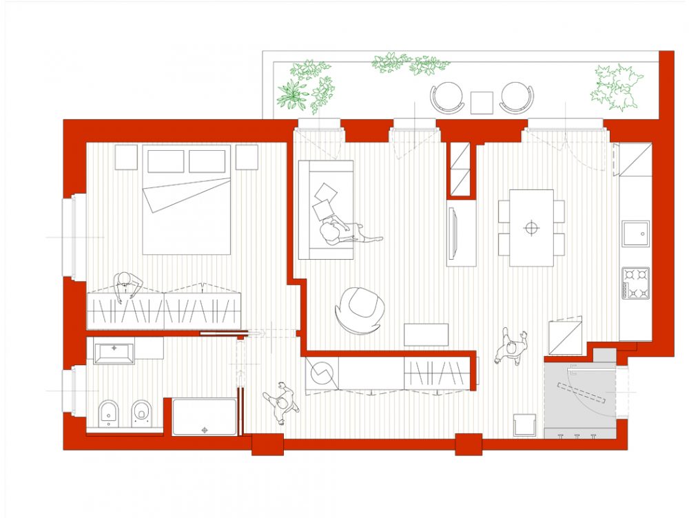 Il progetto di ristrutturazione del bilocale: il soggiorno ha la cucina a vista, in ingresso è stato ricavato un ripostiglio e in camera una comoda cabina armadio.