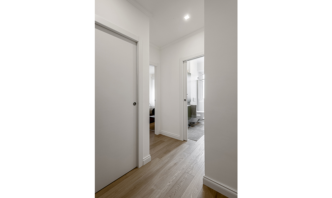In camera, la parete che definisce la cabina armadio è dipinta con lo stesso smalto giallo del soggiorno. la porta scorrevole esterna che la chiude ha il binario nascosto.